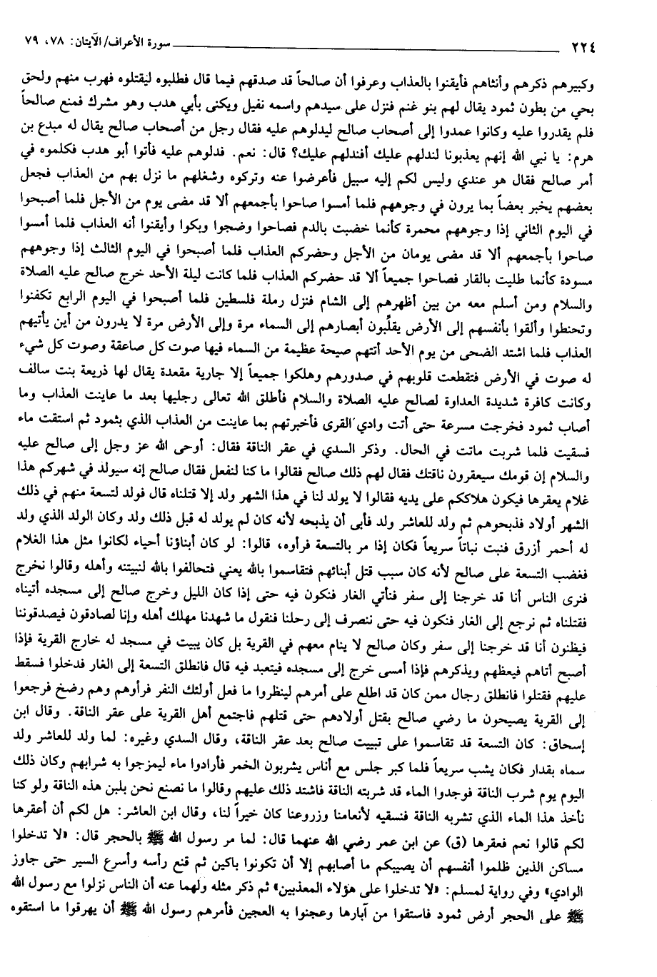 وكبيرهم ذكرهم وأنثاهم فأيقنوا بالعذاب وعرفوا أن صالحا قد صدقهم فيما قال فطلبوه ليقتلوه فهرب منهم ولحق بحي من بطون ثمود يقال لهم بنو غنم فنزل على سيدهم واسمه نفيل ويكنى بأبي هدب وهو مشرك فمنع صالحا فلم يقدروا عليه وكانوا عمدوا إلى أصحاب صالح ليدلوهم عليه فقال رجل من أصحاب صالح يقال له مبدع بن هرم: يا نبي الله إنهم يعذبونا لندلهم عليك أفندلهم عليك؟ قال: نعم. فدلوهم عليه فأتوا أبو هدب فكلموه في أمر صالح فقال هو عندي وليس لكم إليه سبيل فأعرضوا عنه وتركوه وشغلهم ما نزل بهم من العذاب فجعل بعضهم يخبر بعضا بما يرون في وجوههم فلما أمسوا صاحوا بأجمعهم ألا قد مضى يوم من الأجل فلما أصبحوا في اليوم الثاني إذا وجوههم محمرة كأنما خضبت بالدم فصاحوا وضجوا وبكوا وأيقنوا أنه العذاب فلما أمسوا صاحوا بأجمعهم ألا قد مضى يومان من الأجل وحضركم العذاب فلما أصبحوا في اليوم الثالث إذا وجوههم مسودة كأنما طليت بالقار فصاحوا جميعا ألا قد حضركم العذاب فلما كانت ليلة الأحد خرج صالح عليه الصلاة والسلام ومن أسلم معه من بين أظهرهم إلى الشام فنزل رملة فلسطين فلما أصبحوا في اليوم الرابع تكفنوا وتحنطوا وألقوا بأنفسهم إلى الأرض يقلّبون أبصارهم إلى السماء مرة وإلى الأرض مرة لا يدرون من أين يأتيهم العذاب فلما اشتد الضحى من يوم الأحد أتتهم صيحة عظيمة من السماء فيها صوت كل صاعقة وصوت كل شيء له صوت في الأرض فتقطعت قلوبهم في صدورهم وهلكوا جميعا إلا جارية مقعدة يقال لها ذريعة بنت سالف وكانت كافرة شديدة العداوة لصالح عليه الصلاة والسلام فأطلق الله تعالى رجليها بعد ما عاينت العذاب وما أصاب ثمود فخرجت مسرعة حتى أتت وادي القرى فأخبرتهم بما عاينت من العذاب الذي بثمود ثم استقت ماء فسقيت فلما شربت ماتت في الحال. وذكر السدي في عقر الناقة فقال: أوحى الله عز وجل إلى صالح عليه والسلام إن قومك سيعقرون ناقتك فقال لهم ذلك صالح فقالوا ما كنا لنفعل فقال صالح إنه سيولد في شهركم هذا غلام يعقرها فيكون هلاككم على يديه فقالوا لا يولد لنا في هذا الشهر ولد إلا قتلناه قال فولد لتسعة منهم في ذلك الشهر أولاد فذبحوهم ثم ولد للعاشر ولد فأبى أن يذبحه لأنه كان لم يولد له قبل ذلك ولد وكان الولد الذي ولد له أحمر أزرق فنبت نباتا سريعا فكان إذا مر بالتسعة فرأوه، قالوا: لو كان أبناؤنا أحياء لكانوا مثل هذا الغلام فغضب التسعة على صالح لأنه كان سبب قتل أبنائهم فتقاسموا بالله يعني فتحالفوا بالله لنبيتنه وأهله وقالوا نخرج فنرى الناس أنا قد خرجنا إلى سفر فنأتي الغار فنكون فيه حتى إذا كان الليل وخرج صالح إلى مسجده أتيناه فقتلناه ثم نرجع إلى الغار فنكون فيه حتى ننصرف إلى رحلنا فنقول ما شهدنا مهلك أهله وإنا لصادقون فيصدقوننا فيظنون أنا قد خرجنا إلى سفر وكان صالح لا ينام معهم في القرية بل كان يبيت في مسجد له خارج القرية فإذا أصبح أتاهم فيعظهم ويذكرهم فإذا أمسى خرج إلى مسجده فيتعبد فيه قال فانطلق التسعة إلى الغار فدخلوا فسقط عليهم فقتلوا فانطلق رجال ممن كان قد اطلع على أمرهم لينظروا ما فعل أولئك النفر فرأوهم
