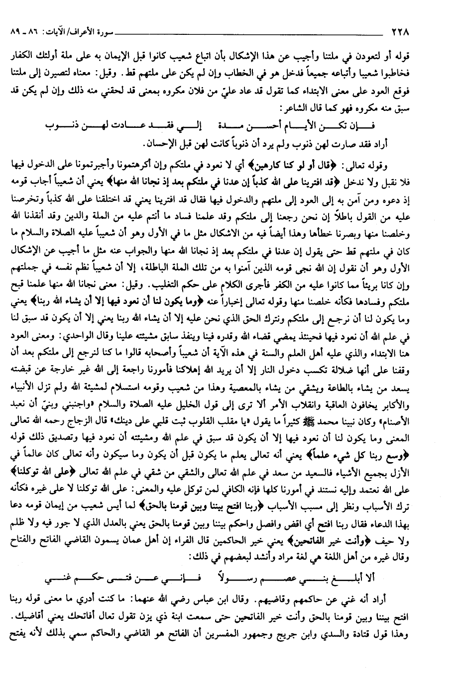 وقوله تعالى: قالَ أَوَلَوْ كُنَّا كارِهِينَ أي لا نعود في ملتكم وإن أكرهتمونا وأجبرتمونا على الدخول فيها فلا نقبل ولا ندخل قَدِ افْتَرَيْنا عَلَى اللَّهِ كَذِباً إِنْ عُدْنا فِي مِلَّتِكُمْ بَعْدَ إِذْ نَجَّانَا اللَّهُ مِنْها يعني أن شعيبا أجاب قومه إذ دعوه ومن آمن به إلى العود إلى ملتهم والدخول فيها فقال قد افترينا يعني قد اختلقنا على الله كذبا وتخرصنا عليه من القول باطلا إن نحن رجعنا إلى ملتكم وقد علمنا فساد ما أنتم عليه من الملة والدين وقد أنقذنا الله وخلصنا منها وبصرنا خطأها وهذا أيضا فيه من الأشكال مثل ما في الأول وهو أن شعيبا عليه الصلاة والسلام ما كان في ملتهم قط حتى يقول إن عدنا في ملتكم بعد إذ نجانا الله منها والجواب عنه مثل ما أجيب عن الإشكال الأول وهو أن نقول إن الله نجى قومه الذين آمنوا به من تلك الملة الباطلة، إلا أن شعيبا نظم نفسه في جملتهم وإن كانا بريئا مما كانوا عليه من الكفر فأجرى الكلام على حكم التغليب. وقيل: معنى نجانا الله منها علمنا قبح ملتكم وفسادها فكأنه خلصنا منها وقوله تعالى إخبارا عنه وَما يَكُونُ لَنا أَنْ نَعُودَ فِيها إِلَّا أَنْ يَشاءَ اللَّهُ رَبُّنا يعني وما يكون لنا أن نرجع إلى ملتكم ونترك الحق الذي نحن عليه إلا أن يشاء الله ربنا يعني إلا أن يكون قد سبق لنا في علم الله أن نعود فيها فحينئذ يمضي قضاء الله وقدره فينا وينفذ سابق مشيئته علينا وقال الواحدي: ومعنى العود هنا الابتداء والذي عليه أهل العلم والسنة في هذه الآية أن شعيبا وأصحابه قالوا ما كنا لنرجع إلى ملتكم بعد أن وقفنا على أنها ضلالة تكسب دخول النار إلا أن يريد الله إهلاكنا فأمورنا راجعة إلى الله غير خارجة عن قبضته يسعد من يشاء بالطاعة ويشقي من يشاء بالمعصية وهذا من شعيب وقومه استسلام لمشيئة الله ولم تزل الأنبياء والأكابر يخافون العاقبة وانقلاب الأمر ألا ترى إلى قول الخليل عليه الصلاة والسلام «واجنبني وبنيّ أن نعبد الأصنام» وكان نبينا محمد صلى الله عليه وسلم كثيرا ما يقول «يا مقلب القلوب ثبت قلبي على دينك» قال الزجاج رحمه الله تعالى المعنى وما يكون لنا أن نعود فيها إلا أن يكون قد سبق في علم الله ومشيئته أن نعود فيها وتصديق ذلك قوله وَسِعَ رَبُّنا كُلَّ شَيْءٍ عِلْماً يعني أنه تعالى يعلم ما يكون قبل أن يكون وما سيكون وأنه تعالى كان عالما في الأزل بجميع الأشياء فالسعيد من سعد في علم الله تعالى والشقي من شقي في علم الله تعالى عَلَى اللَّهِ تَوَكَّلْنا على الله نعتمد وإليه نستند في أمورنا كلها فإنه الكافي لمن توكل عليه والمعنى: على الله توكلنا لا على غيره فكأنه ترك الأسباب ونظر إلى مسبب الأسباب رَبَّنَا افْتَحْ بَيْنَنا وَبَيْنَ قَوْمِنا بِالْحَقِّ لما أيس شعيب من إيمان قومه دعا بهذا الدعاء فقال ربنا افتح أي اقض وافصل واحكم بيننا وبين قومنا بالحق يعني بالعدل الذي لا جور فيه ولا ظلم ولا حيف وَأَنْتَ خَيْرُ الْفاتِحِينَ يعني خير الحاكمين قال الفراء إن أهل عمان يسمون القاضي الفاتح والفتاح وقال غيره من أهل اللغة هي لغة مراد وأنشد لبعضهم في ذلك: