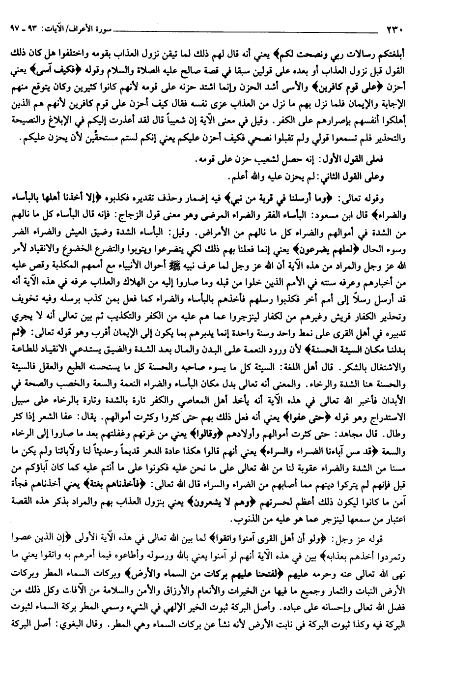 أَبْلَغْتُكُمْ رِسالاتِ رَبِّي وَنَصَحْتُ لَكُمْ يعني أنه قال لهم ذلك لما تيقن نزول العذاب بقومه واختلفوا هل كان ذلك القول قبل نزول العذاب أو بعده على قولين سبقا في قصة صالح عليه الصلاة والسلام وقوله فَكَيْفَ آسى يعني أحزن عَلى قَوْمٍ كافِرِينَ والأسى أشد الحزن وإنما اشتد حزنه على قومه لأنهم كانوا كثيرين وكان يتوقع منهم الإجابة والإيمان فلما نزل بهم ما نزل من العذاب عزى نفسه فقال كيف أحزن على قوم كافرين لأنهم هم الذين أهلكوا أنفسهم بإصرارهم على الكفر. وقيل في معنى الآية إن شعيبا قال لقد أعذرت إليكم في الإبلاغ والنصيحة والتحذير فلم تسمعوا قولي ولم تقبلوا نصحي فكيف أحزن عليكم يعني إنكم لستم مستحقّين لأن يحزن عليكم.