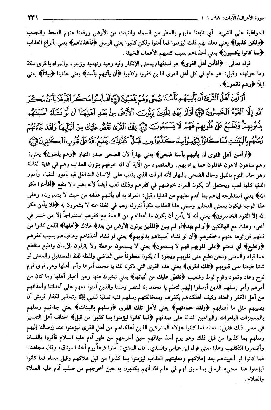 أَوَأَمِنَ أَهْلُ الْقُرى أَنْ يَأْتِيَهُمْ بَأْسُنا ضُحًى وَهُمْ يَلْعَبُونَ (98) أَفَأَمِنُوا مَكْرَ اللَّهِ فَلا يَأْمَنُ مَكْرَ اللَّهِ إِلاَّ الْقَوْمُ الْخاسِرُونَ (99) أَوَلَمْ يَهْدِ لِلَّذِينَ يَرِثُونَ الْأَرْضَ مِنْ بَعْدِ أَهْلِها أَنْ لَوْ نَشاءُ أَصَبْناهُمْ بِذُنُوبِهِمْ وَنَطْبَعُ عَلى قُلُوبِهِمْ فَهُمْ لا يَسْمَعُونَ (100) تِلْكَ الْقُرى نَقُصُّ عَلَيْكَ مِنْ أَنْبائِها وَلَقَدْ جاءَتْهُمْ رُسُلُهُمْ بِالْبَيِّناتِ فَما كانُوا لِيُؤْمِنُوا بِما كَذَّبُوا مِنْ قَبْلُ كَذلِكَ يَطْبَعُ اللَّهُ عَلى قُلُوبِ الْكافِرِينَ (101)