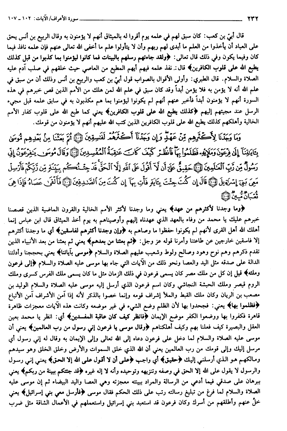 وَما وَجَدْنا لِأَكْثَرِهِمْ مِنْ عَهْدٍ وَإِنْ وَجَدْنا أَكْثَرَهُمْ لَفاسِقِينَ (102) ثُمَّ بَعَثْنا مِنْ بَعْدِهِمْ مُوسى بِآياتِنا إِلى فِرْعَوْنَ وَمَلائِهِ فَظَلَمُوا بِها فَانْظُرْ كَيْفَ كانَ عاقِبَةُ الْمُفْسِدِينَ (103) وَقالَ مُوسى يا فِرْعَوْنُ إِنِّي رَسُولٌ مِنْ رَبِّ الْعالَمِينَ (104) حَقِيقٌ عَلى أَنْ لا أَقُولَ عَلَى اللَّهِ إِلاَّ الْحَقَّ قَدْ جِئْتُكُمْ بِبَيِّنَةٍ مِنْ رَبِّكُمْ فَأَرْسِلْ مَعِيَ بَنِي إِسْرائِيلَ (105) قالَ إِنْ كُنْتَ جِئْتَ بِآيَةٍ فَأْتِ بِها إِنْ كُنْتَ مِنَ الصَّادِقِينَ (106)