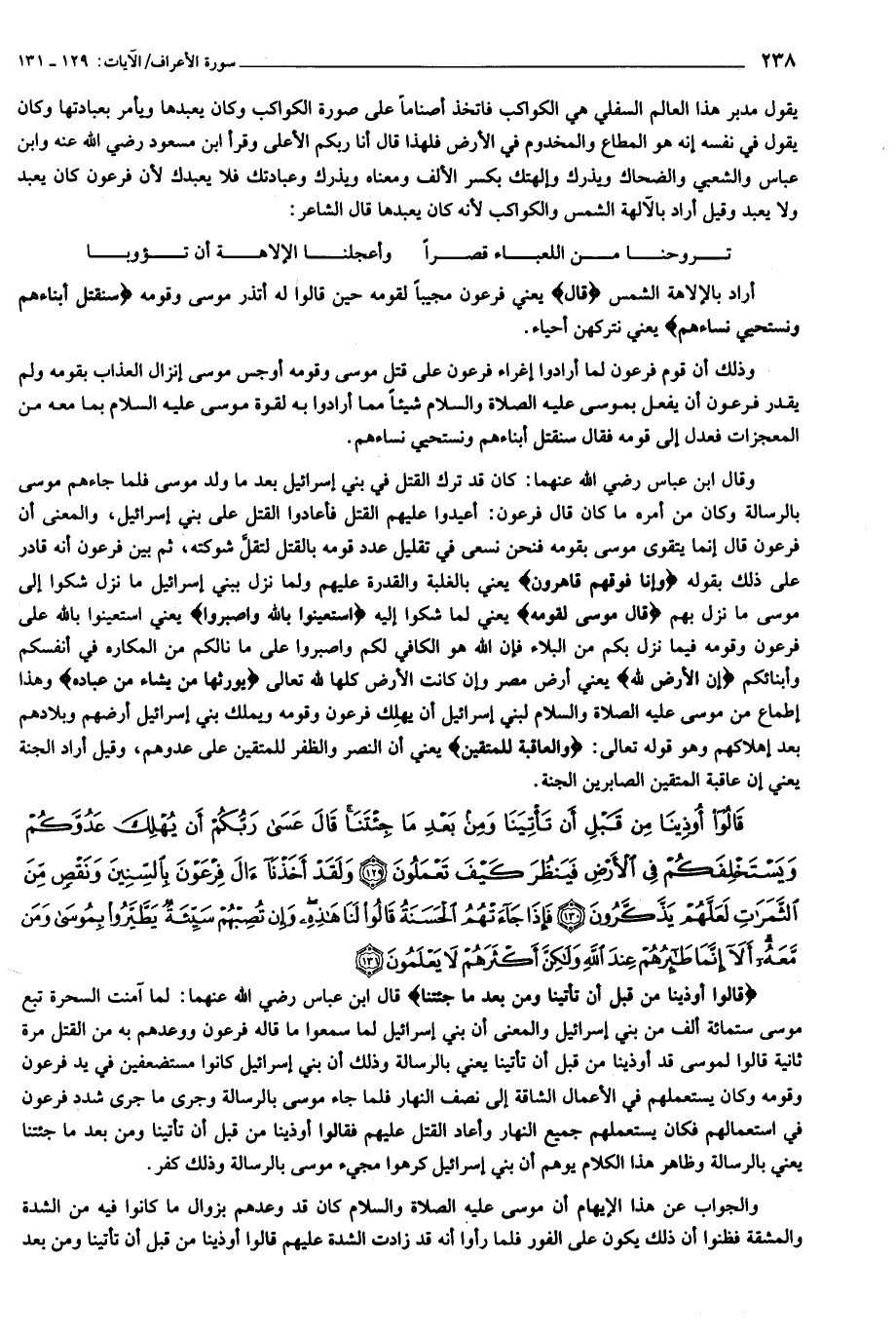 قالُوا أُوذِينا مِنْ قَبْلِ أَنْ تَأْتِيَنا وَمِنْ بَعْدِ ما جِئْتَنا قالَ عَسى رَبُّكُمْ أَنْ يُهْلِكَ عَدُوَّكُمْ وَيَسْتَخْلِفَكُمْ فِي الْأَرْضِ فَيَنْظُرَ كَيْفَ تَعْمَلُونَ (129) وَلَقَدْ أَخَذْنا آلَ فِرْعَوْنَ بِالسِّنِينَ وَنَقْصٍ مِنَ الثَّمَراتِ لَعَلَّهُمْ يَذَّكَّرُونَ (130) فَإِذا جاءَتْهُمُ الْحَسَنَةُ قالُوا لَنا هذِهِ وَإِنْ تُصِبْهُمْ سَيِّئَةٌ يَطَّيَّرُوا بِمُوسى وَمَنْ مَعَهُ أَلا إِنَّما طائِرُهُمْ عِنْدَ اللَّهِ وَلكِنَّ أَكْثَرَهُمْ لا يَعْلَمُونَ (131)