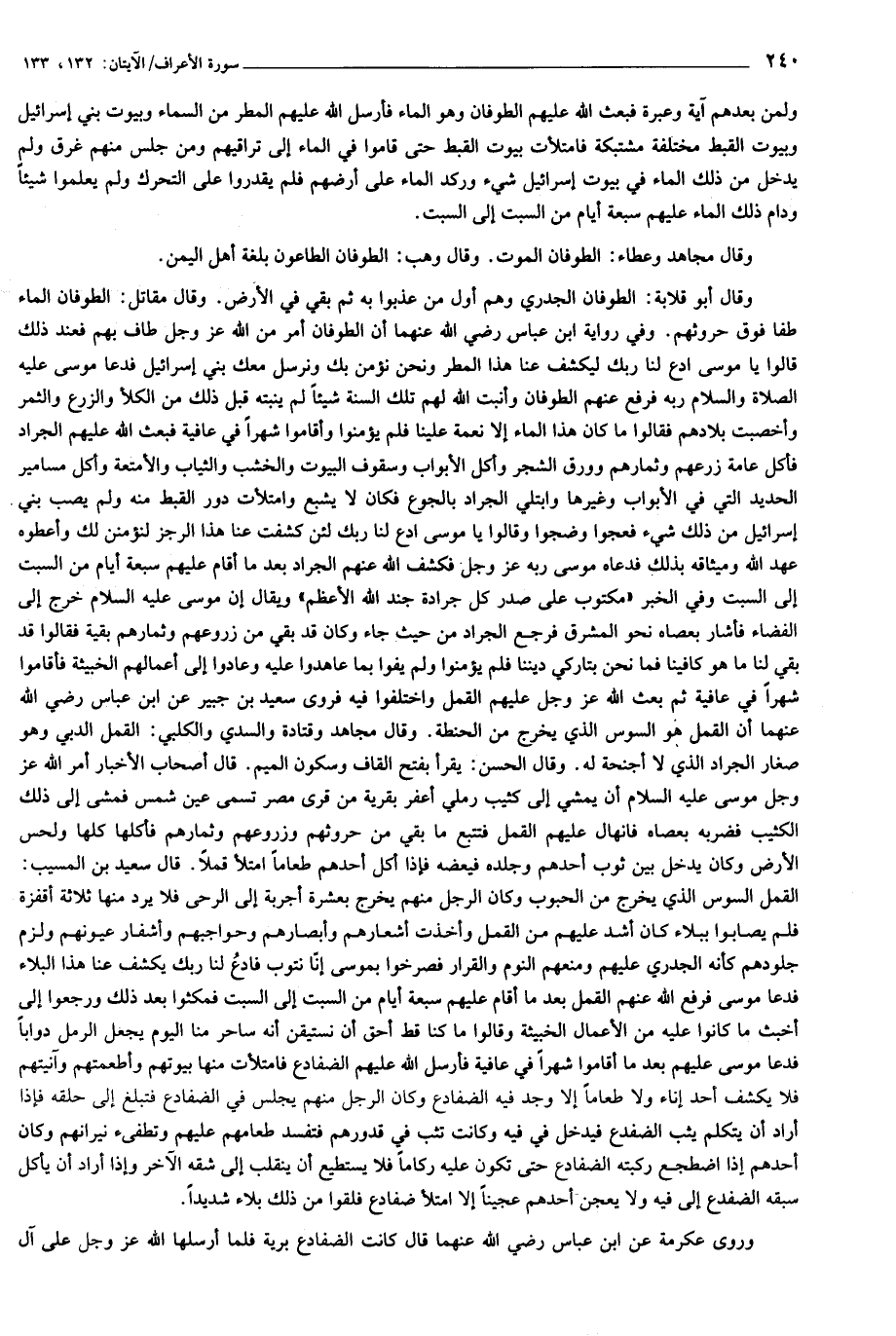 وقال أبو قلابة: الطوفان الجدري وهم أول من عذبوا به ثم بقي في الأرض. وقال مقاتل: الطوفان الماء طفا فوق حروثهم. وفي رواية ابن عباس رضي الله عنهما أن الطوفان أمر من الله عز وجل طاف بهم فعند ذلك قالوا يا موسى ادع لنا ربك ليكشف عنا هذا المطر ونحن نؤمن بك ونرسل معك بني إسرائيل فدعا موسى عليه الصلاة والسلام ربه فرفع عنهم الطوفان وأنبت الله لهم تلك السنة شيئا لم ينبته قبل ذلك من الكلأ والزرع والثمر وأخصبت بلادهم فقالوا ما كان هذا الماء إلا نعمة علينا فلم يؤمنوا وأقاموا شهرا في عافية فبعث الله عليهم الجراد فأكل عامة زرعهم وثمارهم وورق الشجر وأكل الأبواب وسقوف البيوت والخشب والثياب والأمتعة وأكل مسامير الحديد التي في الأبواب وغيرها وابتلي الجراد بالجوع فكان لا يشبع وامتلأت دور القبط منه ولم يصب بني إسرائيل من ذلك شيء فعجوا وضجوا وقالوا يا موسى ادع لنا ربك لئن كشفت عنا هذا الرجز لنؤمنن لك وأعطوه عهد الله وميثاقه بذلك فدعاه موسى ربه عز وجل فكشف الله عنهم الجراد بعد ما أقام عليهم سبعة أيام من السبت إلى السبت وفي الخبر «مكتوب على صدر كل جرادة جند الله الأعظم» ويقال إن موسى عليه السلام خرج إلى الفضاء فأشار بعصاه نحو المشرق فرجع الجراد من حيث جاء وكان قد بقي من زروعهم وثمارهم بقية فقالوا قد بقي لنا ما هو كافينا فما نحن بتاركي ديننا فلم يؤمنوا ولم يفوا بما عاهدوا عليه وعادوا إلى أعمالهم الخبيثة فأقاموا شهرا في عافية ثم بعث الله عز وجل عليهم القمل واختلفوا فيه فروى سعيد بن جبير عن ابن عباس رضي الله عنهما أن القمل هو السوس الذي يخرج من الحنطة. وقال مجاهد وقتادة والسدي والكلبي: القمل الدبي وهو صغار الجراد الذي لا أجنحة له. وقال الحسن: يقرأ بفتح القاف وسكون الميم. قال أصحاب الأخبار أمر الله عز وجل موسى عليه السلام أن يمشي إلى كثيب رملي أعفر بقرية من قرى مصر تسمى عين شمس فمشى إلى ذلك الكثيب فضربه بعصاه فانهال عليهم القمل فتتبع ما بقي من حروثهم وزروعهم وثمارهم فأكلها كلها ولحس الأرض وكان يدخل بين ثوب أحدهم وجلده فيعضه فإذا أكل أحدهم طعاما امتلأ قملا. قال سعيد بن المسيب:
