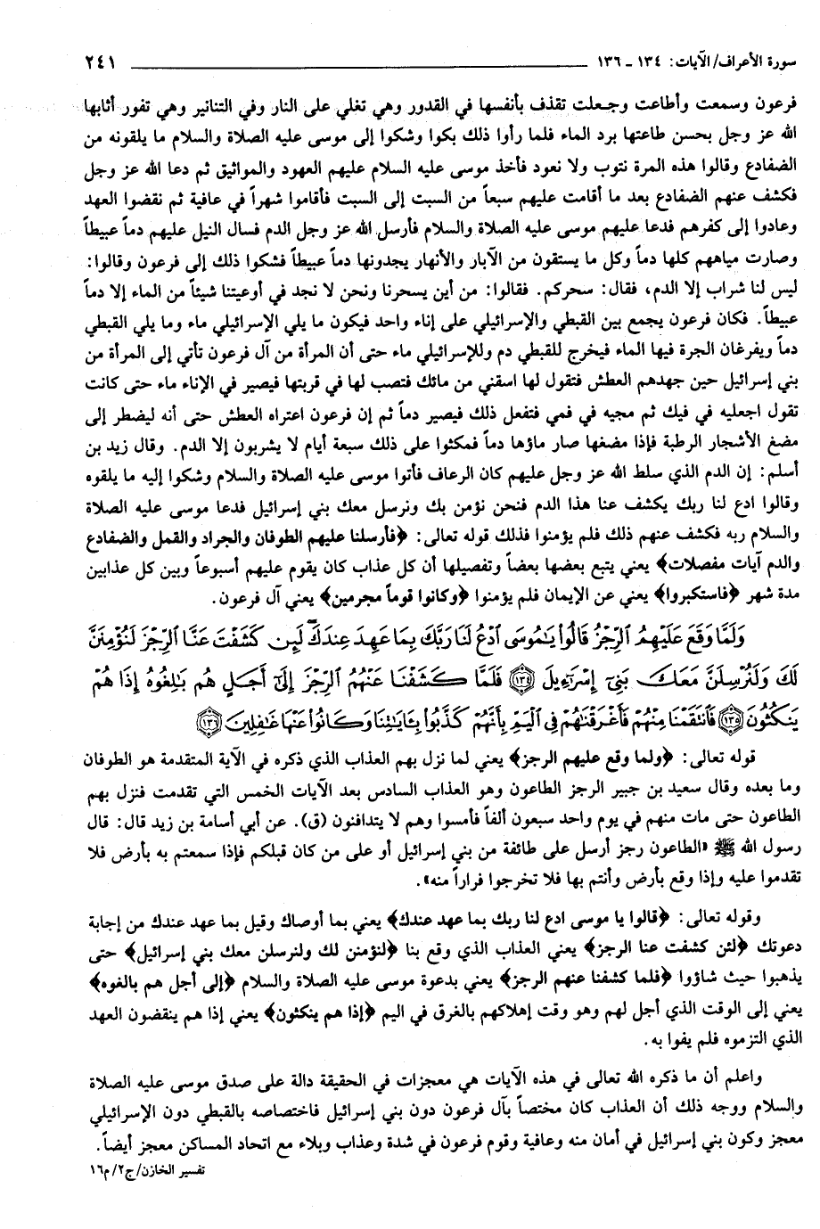 قوله تعالى: وَلَمَّا وَقَعَ عَلَيْهِمُ الرِّجْزُ يعني لما نزل بهم العذاب الذي ذكره في الآية المتقدمة هو الطوفان وما بعده وقال سعيد بن جبير الرجز الطاعون وهو العذاب السادس بعد الآيات الخمس التي تقدمت فنزل بهم الطاعون حتى مات منهم في يوم واحد سبعون ألفا فأمسوا وهم لا يتدافنون (ق). عن أبي أسامة بن زيد قال: قال رسول الله صلى الله عليه وسلم «الطاعون رجز أرسل على طائفة من بني إسرائيل أو على من كان قبلكم فإذا سمعتم به بأرض فلا تقدموا عليه وإذا وقع بأرض وأنتم بها فلا تخرجوا فرارا منه».