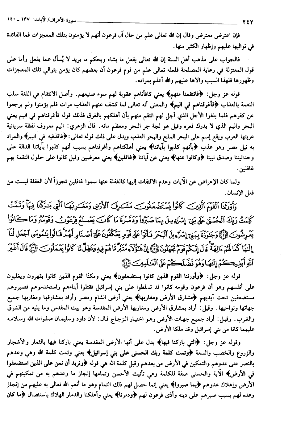 وَأَوْرَثْنَا الْقَوْمَ الَّذِينَ كانُوا يُسْتَضْعَفُونَ مَشارِقَ الْأَرْضِ وَمَغارِبَهَا الَّتِي بارَكْنا فِيها وَتَمَّتْ كَلِمَتُ رَبِّكَ الْحُسْنى عَلى بَنِي إِسْرائِيلَ بِما صَبَرُوا وَدَمَّرْنا ما كانَ يَصْنَعُ فِرْعَوْنُ وَقَوْمُهُ وَما كانُوا يَعْرِشُونَ (137) وَجاوَزْنا بِبَنِي إِسْرائِيلَ الْبَحْرَ فَأَتَوْا عَلى قَوْمٍ يَعْكُفُونَ عَلى أَصْنامٍ لَهُمْ قالُوا يا مُوسَى اجْعَلْ لَنا إِلهاً كَما لَهُمْ آلِهَةٌ قالَ إِنَّكُمْ قَوْمٌ تَجْهَلُونَ (138) إِنَّ هؤُلاءِ مُتَبَّرٌ ما هُمْ فِيهِ وَباطِلٌ ما كانُوا يَعْمَلُونَ (139) قالَ أَغَيْرَ اللَّهِ أَبْغِيكُمْ إِلهاً وَهُوَ فَضَّلَكُمْ عَلَى الْعالَمِينَ (140)