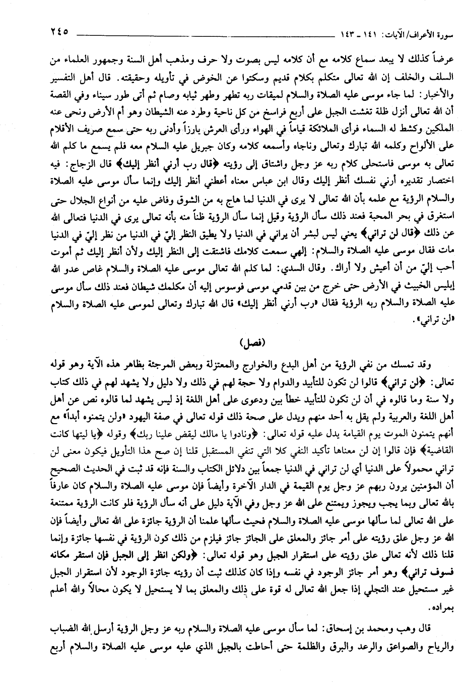 ((فصل)) وقد تمسك من نفي الرؤية من أهل البدع والخوارج والمعتزلة وبعض المرجئة بظاهر هذه الآية وهو قوله تعالى: لَنْ تَرانِي قالوا لن تكون للتأبيد والدوام ولا حجة لهم في ذلك ولا دليل ولا يشهد لهم في ذلك كتاب ولا سنة وما قالوه في أن لن تكون للتأبيد خطأ بين ودعوى على أهل اللغة إذ ليس يشهد لما قالوه نص عن أهل أهل اللغة والعربية ولم يقل به أحد منهم ويدل على صحة ذلك قوله تعالى في صفة اليهود «ولن يتمنوه أبدا» مع أنهم يتمنون الموت يوم القيامة يدل عليه قوله تعالى: وَنادَوْا يا مالِكُ لِيَقْضِ عَلَيْنا رَبُّكَ وقوله يا لَيْتَها كانَتِ الْقاضِيَةَ فإن قالوا إن لن معناها تأكيد النفي كلا التي تنفي المستقبل قلنا إن صح هذا التأويل فيكون معنى لن تراني محمولا على الدنيا أي لن تراني في الدنيا جمعا بين دلائل الكتاب والسنة فإنه قد ثبت في الحديث الصحيح أن المؤمنين يرون ربهم عز وجل يوم القيمة في الدار الآخرة وأيضا فإن موسى عليه الصلاة والسلام كان عارفا بالله تعالى وبما يجب ويجوز ويمتنع على الله عز وجل وفي الآية دليل على أنه سأل الرؤية فلو كانت الرؤية ممتنعة على الله تعالى لما سألها موسى عليه الصلاة والسلام فحيث سألها علمنا أن الرؤية جائزة على الله تعالى وأيضا فإن الله عز وجل علق رؤيته على أمر جائز والمعلق على الجائز جائز فيلزم من ذلك كون الرؤية في نفسها جائزة وإنما قلنا ذلك لأنه تعالى علق رؤيته على استقرار الجبل وهو قوله تعالى: وَلكِنِ انْظُرْ إِلَى الْجَبَلِ فَإِنِ اسْتَقَرَّ مَكانَهُ فَسَوْفَ تَرانِي وهو أمر جائز الوجود في نفسه وإذا كان كذلك ثبت أن رؤيته جائزة الوجود لأن استقرار الجبل غير مستحيل عند التجلي إذا جعل الله تعالى له قوة على ذلك والمعلق بما لا يستحيل لا يكون محالا والله أعلم بمراده.