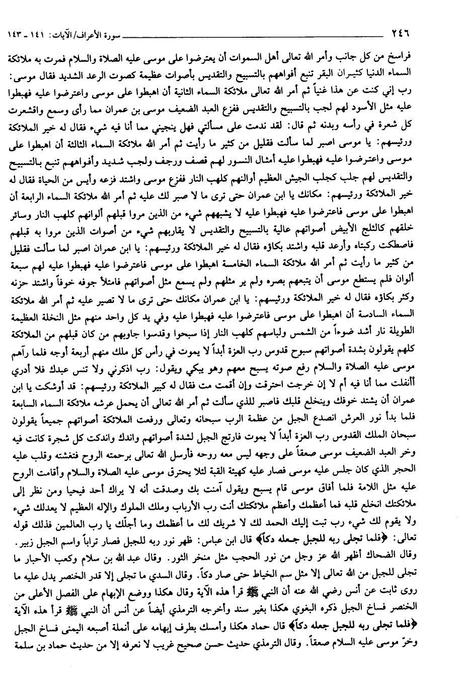 رب إني كنت عن هذا غنيا ثم أمر الله تعالى ملائكة السماء الثانية أن اهبطوا على موسى واعترضوا عليه فهبطوا عليه مثل الأسود لهم لجب بالتسبيح والتقديس ففزع العبد الضعيف موسى بن عمران مما رأى وسمع واقشعرت كل شعرة في رأسه وبدنه ثم قال: لقد ندمت على مسألتي فهل ينجيني مما أنا فيه شيء فقال له خير الملائكة ورئيسهم: يا موسى اصبر لما سألت فقليل من كثير ما رأيت ثم أمر الله ملائكة السماء الثالثة أن اهبطوا على موسى واعترضوا عليه فهبطوا عليه أمثال النسور لهم قصف ورجف ولجب شديد وأفواههم تنبع بالتسبيح والتقديس لهم جلب كجلب الجيش العظيم أو النهم كلهب النار ففزع موسى واشتد فزعه وأيس من الحياة فقال له خير الملائكة ورئيسهم: مكانك يا ابن عمران حتى ترى ما لا صبر لك عليه ثم أمر الله ملائكة السماء الرابعة أن اهبطوا على موسى فاعترضوا عليه فهبطوا عليه لا يشبههم شيء من الذين مروا قبلهم ألوانهم كلهب النار وسائر خلقهم كالثلج الأبيض أصواتهم عالية بالتسبيح والتقديس لا يقاربهم شيء من أصوات الذين مروا به قبلهم فاصطكت ركبتاه وأرعد قلبه واشتد بكاؤه فقال له خير الملائكة ورئيسهم: يا ابن عمران اصبر لما سألت فقليل من كثير ما رأيت ثم أمر الله ملائكة السماء الخامسة اهبطوا على موسى فاعترضوا عليه فهبطوا عليه لهم سبعة ألوان فلم يستطع موسى أن يتبعهم بصره ولم ير مثلهم ولم يسمع مثل أصواتهم فامتلأ جوفه خوفا واشتد حزنه وكثر بكاؤه فقال له خير الملائكة ورئيسهم: يا ابن عمران مكانك حتى ترى ما لا تصير عليه ثم أمر الله ملائكة السماء السادسة أن اهبطوا على موسى فاعترضوا عليه فهبطوا عليه وفي يد كل واحد منهم مثل النخلة العظيمة الطويلة نار أشد ضوءا من الشمس ولباسهم كلهب النار إذا سبحوا وقدسوا جاوبهم من كان قبلهم من الملائكة كلهم يقولون بشدة أصواتهم سبوح قدوس رب العزة أبدا لا يموت في رأس كل ملك منهم أربعة أوجه فلما رآهم موسى عليه الصلاة والسلام رفع صوته يسبح معهم وهو يبكي ويقول: رب اذكرني ولا تنس عبدك فلا أدري أأنفلت مما أنا فيه أم لا إن خرجت احترقت وإن أقمت مت فقال له كبير الملائكة ورئيسهم: قد أوشكت يا ابن عمران أن يشتد خوفك وينخلع قلبك فاصبر للذي سألت ثم أمر الله تعالى أن يحمل عرشه ملائكة السماء السابعة فلما بدأ نور العرش انصدع الجبل من عظمة الرب سبحانه وتعالى ورفعت الملائكة أصواتهم جميعا يقولون سبحان الملك القدوس رب العزة أبدا لا يموت فارتج الجبل لشدة أصواتهم واندك واندكت كل شجرة كانت فيه وخر العبد الضعيف موسى صعقا على وجهه ليس معه روحه فأرسل الله تعالى برحمته الروح فتغشته وقلب عليه الحجر الذي كان جلس عليه موسى فصار عليه كهيئة القبة لئلا يحترق موسى عليه الصلاة والسلام وأقامت الروح عليه مثل اللامة فلما أفاق موسى قام يسبح ويقول آمنت بك وصدقت أنه لا يراك أحد فيحيا ومن نظر إلى ملائكتك انخلع قلبه فما أعظمك وأعظم ملائكتك أنت رب الأرباب وملك الملوك والإله العظيم لا يعدلك شيء ولا يقوم لك شيء رب تبت إليك الحمد لك لا شريك لك ما أعظمك وما أجلّك يا رب العالمين فذلك قوله تعالى: فَلَمَّا تَجَلَّى رَبُّهُ لِلْجَبَلِ جَعَلَهُ دَكًّا قال ابن عباس: ظهر نور ربه للجبل فصار ترابا واسم الجبل زبير.
