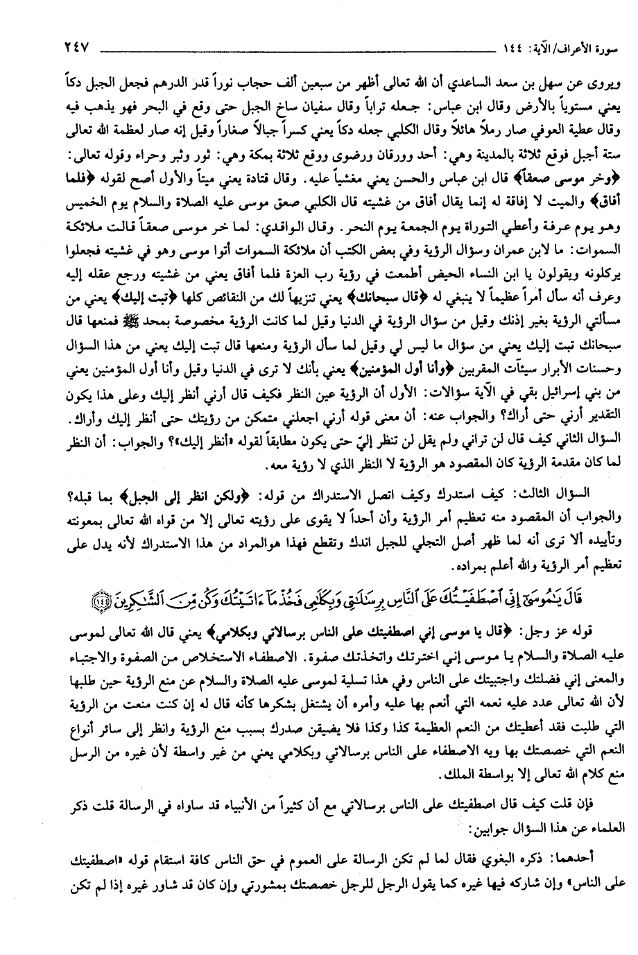 وَخَرَّ مُوسى صَعِقاً قال ابن عباس والحسن يعني مغشيا عليه. وقال قتادة يعني ميتا والأول أصح لقوله فَلَمَّا أَفاقَ والميت لا إفاقة له إنما يقال أفاق من غشيته قال الكلبي صعق موسى عليه الصلاة والسلام يوم الخميس وهو يوم عرفة وأعطي التوراة يوم الجمعة يوم النحر. وقال الواقدي: لما خر موسى صعقا قالت ملائكة السموات: ما لابن عمران وسؤال الرؤية وفي بعض الكتب أن ملائكة السموات أتوا موسى وهو في غشيته فجعلوا يركلونه ويقولون يا ابن النساء الحيض أطمعت في رؤية رب العزة فلما أفاق يعني من غشيته ورجع عقله إليه وعرف أنه سأل أمرا عظيما لا ينبغي له قالَ سُبْحانَكَ يعني تنزيها لك من النقائص كلها تُبْتُ إِلَيْكَ يعني من مسألتي الرؤية بغير إذنك وقيل من سؤال الرؤية في الدنيا وقيل لما كانت الرؤية مخصوصة بمحمد صلى الله عليه وسلم فمنعها قال سبحانك تبت إليك يعني من سؤال ما ليس لي وقيل لما سأل الرؤية ومنعها قال تبت إليك يعني من هذا السؤال وحسنات الأبرار سيئات المقربين وَأَنَا أَوَّلُ الْمُؤْمِنِينَ يعني بأنك لا ترى في الدنيا وقيل وأنا أول المؤمنين يعني من بني إسرائيل بقي في الآية سؤالات: الأول أن الرؤية عين النظر فكيف قال أرني أنظر إليك وعلى هذا يكون التقدير أرني حتى أراك؟ والجواب عنه: أن معنى قوله أرني اجعلني متمكن من رؤيتك حتى أنظر إليك وأراك.
