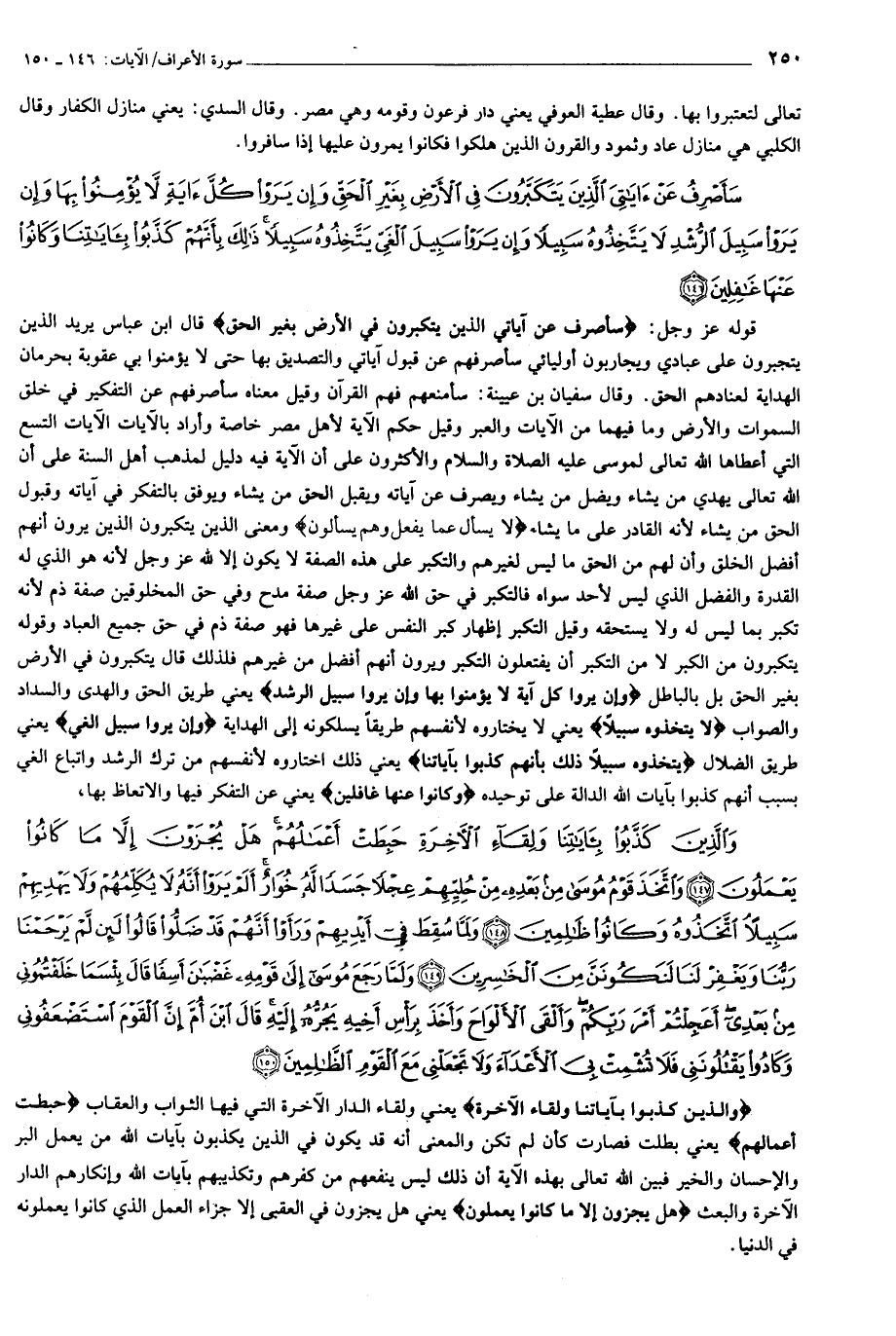 قوله عز وجل: سَأَصْرِفُ عَنْ آياتِيَ الَّذِينَ يَتَكَبَّرُونَ فِي الْأَرْضِ بِغَيْرِ الْحَقِّ قال ابن عباس يريد الذين يتجبرون على عبادي ويحاربون أوليائي سأصرفهم عن قبول آياتي والتصديق بها حتى لا يؤمنوا بي عقوبة بحرمان الهداية لعنادهم الحق. وقال سفيان بن عيينة: سأمنعهم فهم القرآن وقيل معناه سأصرفهم عن التفكير في خلق السموات والأرض وما فيهما من الآيات والعبر وقيل حكم الآية لأهل مصر خاصة وأراد بالآيات الآيات التسع التي أعطاها الله تعالى لموسى عليه الصلاة والسلام والأكثرون على أن الآية فيه دليل لمذهب أهل السنة على أن الله تعالى يهدي من يشاء ويضل من يشاء ويصرف عن آياته ويقبل الحق من يشاء ويوفق بالتفكر في آياته وقبول الحق من يشاء لأنه القادر على ما يشاء لا يُسْئَلُ عَمَّا يَفْعَلُ وَهُمْ يُسْئَلُونَ ومعنى الذين يتكبرون الذين يرون أنهم أفضل الخلق وأن لهم من الحق ما ليس لغيرهم والتكبر على هذه الصفة لا يكون إلا لله عز وجل لأنه هو الذي له القدرة والفضل الذي ليس لأحد سواه فالتكبر في حق الله عز وجل صفة مدح وفي حق المخلوقين صفة ذم لأنه تكبر بما ليس له ولا يستحقه وقيل التكبر إظهار كبر النفس على غيرها فهو صفة ذم في حق جميع العباد وقوله يتكبرون من الكبر لا من التكبر أن يفتعلون التكبر ويرون أنهم أفضل من غيرهم فلذلك قال يتكبرون في الأرض بغير الحق بل بالباطل وَإِنْ يَرَوْا كُلَّ آيَةٍ لا يُؤْمِنُوا بِها وَإِنْ يَرَوْا سَبِيلَ الرُّشْدِ يعني طريق الحق والهدى والسداد والصواب لا يَتَّخِذُوهُ سَبِيلًا يعني لا يختاروه لأنفسهم طريقا يسلكونه إلى الهداية وَإِنْ يَرَوْا سَبِيلَ الغَيِّ يعني طريق الضلال يَتَّخِذُوهُ سَبِيلًا ذلِكَ بِأَنَّهُمْ كَذَّبُوا بِآياتِنا يعني ذلك اختاروه لأنفسهم من ترك الرشد واتباع الغي بسبب أنهم كذبوا بآيات الله الدالة على توحيده وَكانُوا عَنْها غافِلِينَ يعني عن التفكر فيها والاتعاظ بها،