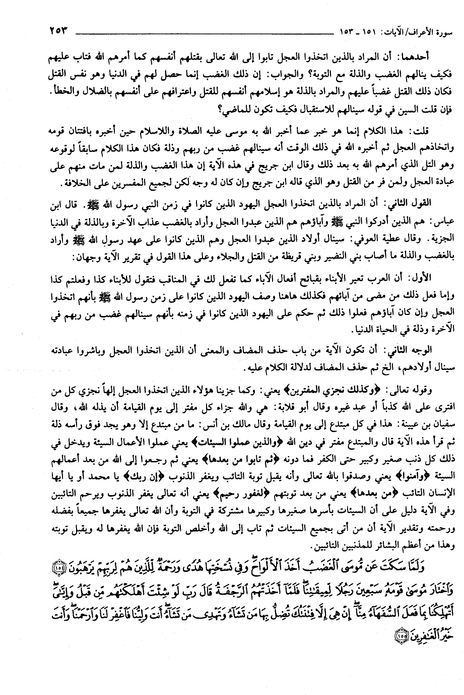 وقوله تعالى: وَكَذلِكَ نَجْزِي الْمُفْتَرِينَ يعني: وكما جزينا هؤلاء الذين اتخذوا العجل إلها نجزي كل من افترى على الله كذبا أو عبد غيره وقال أبو قلابة: هي والله جزاء كل مفتر إلى يوم القيامة أن يذله الله، وقال سفيان بن عيينة: هذا في كل مبتدع إلى يوم القيامة وقال مالك بن أنس: ما من مبتدع إلا وهو يجد فوق رأسه ذلة ثم قرأ هذه الآية قال والمبتدع مفتر في دين الله وَالَّذِينَ عَمِلُوا السَّيِّئاتِ يعني عملوا الأعمال السيئة ويدخل في ذلك كل ذنب صغير وكبير حتى الكفر فما دونه ثُمَّ تابُوا مِنْ بَعْدِها يعني ثم رجعوا إلى الله من بعد أعمالهم السيئة وَآمَنُوا يعني وصدقوا بالله تعالى وأنه يقبل توبة التائب ويغفر الذنوب إِنَّ رَبَّكَ يا محمد أو يا أيها الإنسان التائب مِنْ بَعْدِها يعني من بعد توبتهم لَغَفُورٌ رَحِيمٌ يعني أنه تعالى يغفر الذنوب ويرحم التائبين وفي الآية دليل على أن السيئات بأسرها صغيرها وكبيرها مشتركة في التوبة وأن الله تعالى يغفرها جميعا بفضله ورحمته وتقدير الآية أن من أتى بجميع السيئات ثم تاب إلى الله وأخلص التوبة فإن الله يغفرها له ويقبل توبته وهذا من أعظم البشائر للمذنبين التائبين.
