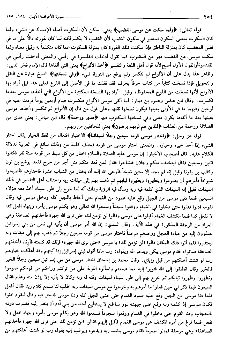 قوله تعالى: وَلَمَّا سَكَتَ عَنْ مُوسَى الْغَضَبُ يعني: سكن لأن السكوت أصله الإمساك عن الشيء ولما كان السكوت بمعنى السكون استعير في سكون الغضب لأن الغضب لا يتكلم لكنه لما كان بفورته دالّا على ما في نفس المغضب كان بمنزلة الناطق فإذا سكنت تلك الفورة كان بمنزلة السكوت عما كان متكلما به وقيل معناه ولما سكت موسى عن الغضب فهو من المقلوب كما تقول أدخلت القلنسوة في رأسي والمعنى أدخلت رأسي في القلنسوة والقول الأول أصح لأنه قول أهل اللغة والتفسير أَخَذَ الْأَلْواحَ يعني التي ألقاها قال الإمام فخر الدين: