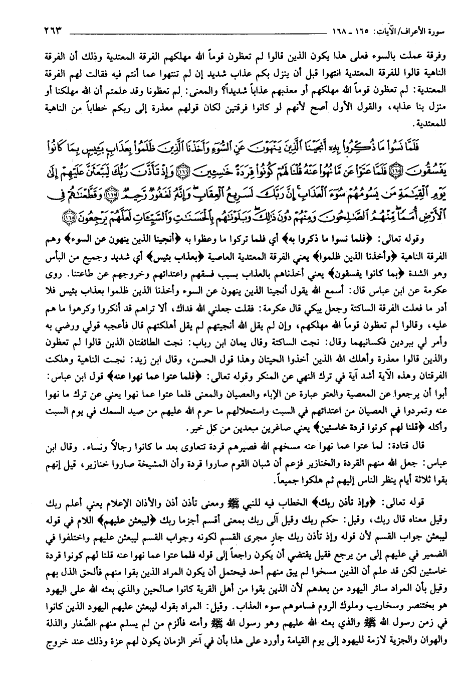 فَلَمَّا نَسُوا ما ذُكِّرُوا بِهِ أَنْجَيْنَا الَّذِينَ يَنْهَوْنَ عَنِ السُّوءِ وَأَخَذْنَا الَّذِينَ ظَلَمُوا بِعَذابٍ بَئِيسٍ بِما كانُوا يَفْسُقُونَ (165) فَلَمَّا عَتَوْا عَنْ ما نُهُوا عَنْهُ قُلْنا لَهُمْ كُونُوا قِرَدَةً خاسِئِينَ (166) وَإِذْ تَأَذَّنَ رَبُّكَ لَيَبْعَثَنَّ عَلَيْهِمْ إِلى يَوْمِ الْقِيامَةِ مَنْ يَسُومُهُمْ سُوءَ الْعَذابِ إِنَّ رَبَّكَ لَسَرِيعُ الْعِقابِ وَإِنَّهُ لَغَفُورٌ رَحِيمٌ (167) وَقَطَّعْناهُمْ فِي الْأَرْضِ أُمَماً مِنْهُمُ الصَّالِحُونَ وَمِنْهُمْ دُونَ ذلِكَ وَبَلَوْناهُمْ بِالْحَسَناتِ وَالسَّيِّئاتِ لَعَلَّهُمْ يَرْجِعُونَ (168)
