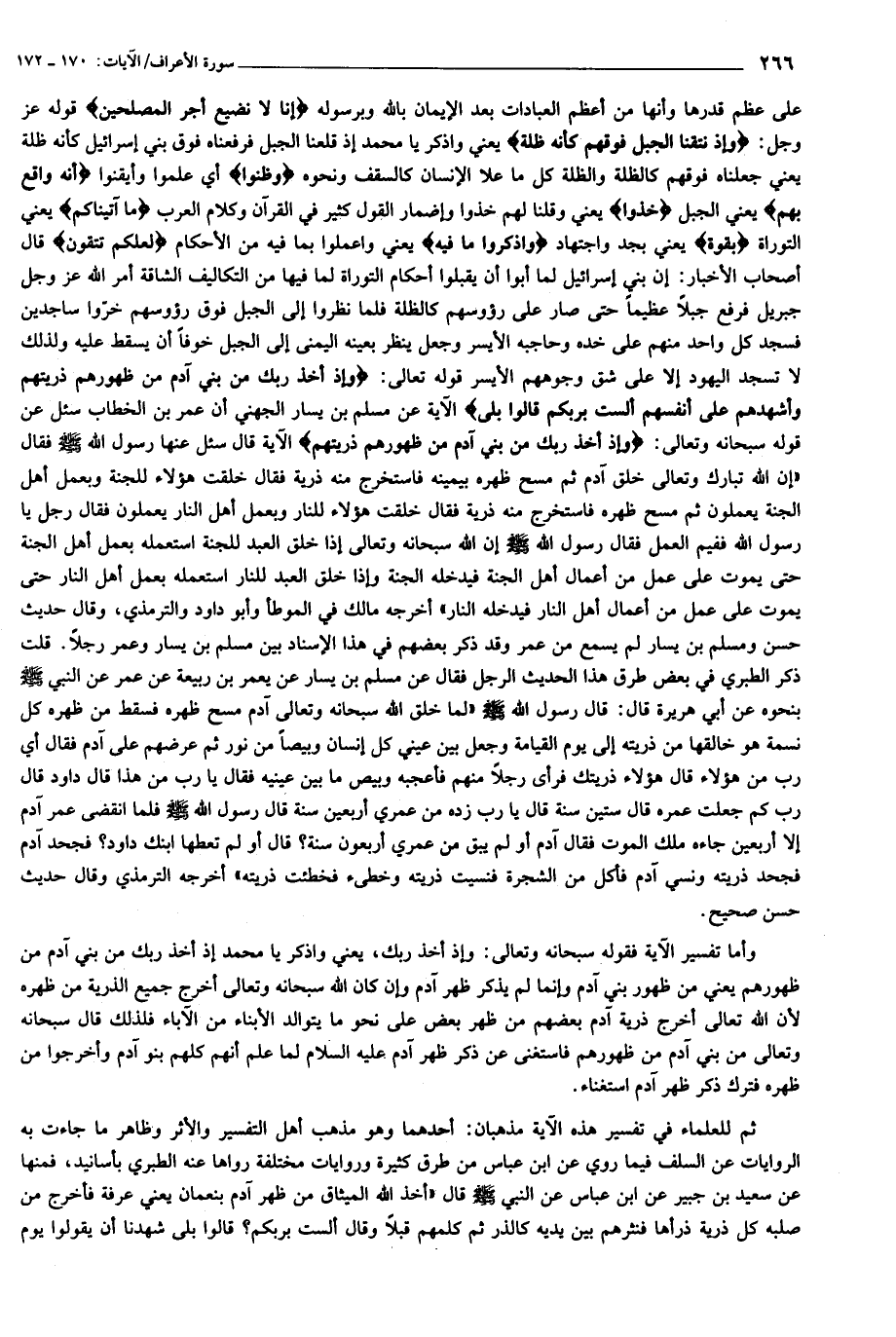 ثم للعلماء في تفسير هذه الآية مذهبان: أحدهما وهو مذهب أهل التفسير والأثر وظاهر ما جاءت به الروايات عن السلف فيما روي عن ابن عباس من طرق كثيرة وروايات مختلفة رواها عنه الطبري بأسانيد، فمنها عن سعيد بن جبير عن ابن عباس عن النبي صلى الله عليه وسلم قال «أخذ الله الميثاق من ظهر آدم بنعمان يعني عرفة فأخرج من صلبه كل ذرية ذرأها فنثرهم بين يديه كالذر ثم كلمهم قبلا وقال ألست بربكم؟ قالوا بلى شهدنا أن يقولوا يوم