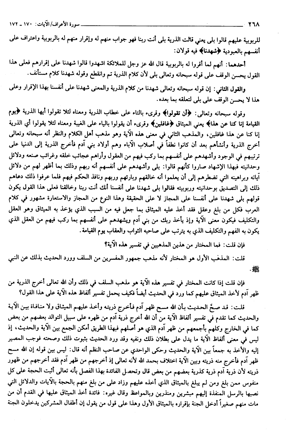 وقوله سبحانه وتعالى: أَنْ تَقُولُوا وقرئ بالتاء على خطاب الذرية ومعناه لئلا تقولوا أيها الذرية يَوْمَ الْقِيامَةِ إِنَّا كُنَّا عَنْ هذا يعني الميثاق غافِلِينَ وقرئ أن يقولوا بالياء على الغيبة ومعناه لئلا يقولوا أي الذرية إنا كنا عن هذا غافلين، والمذهب الثاني في معنى هذه الآية وهو مذهب أهل الكلام والنظر أنه سبحانه وتعالى أخرج الذرية وأنشأهم بعد أن كانوا نطفا في أصلاب الآباء وهم أولاد بني آدم فأخرج الذرية إلى الدنيا على ترتيبهم في الوجود وأشهدهم على أنفسهم بما ركب فيهم من العقول وأراهم عجائب خلقه وغرائب صنعه ودلائل وحدانيته فبهذا الإشهاد صاروا كأنهم قالوا: بلى وأشهدهم على أنفسهم أنه ربهم وذلك بما أظهر لهم من دلائل آياته وبراهينه التي تضطرهم إلى أن يعلموا أنه خالقهم وبارئهم وربهم ونافذ الحكم فيهم فلما عرفوا ذلك دعاهم ذلك إلى التصديق بوحدانيته وربوبيته فقالوا بلى شهدنا على أنفسنا أنك أنت ربنا وخالقنا فعلى هذا القول يكون قولهم بلى شهدنا على أنفسنا على المجاز لا على الحقيقة وهذا النوع من المجاز والاستعارة مشهور في كلام العرب فكل من بلغ وعقل فقد أخذ عليه الميثاق بما جعل فيه من السبب الذي يؤخذ به الميثاق وهو العقل والتكليف فيكون معنى الآية وإذ يأخذ ربك من بني آدم ويشهدهم على أنفسهم بما ركب فيهم من العقل الذي يكون به الفهم والتكليف الذي به يترتب على صاحبه الثواب والعقاب يوم القيامة.