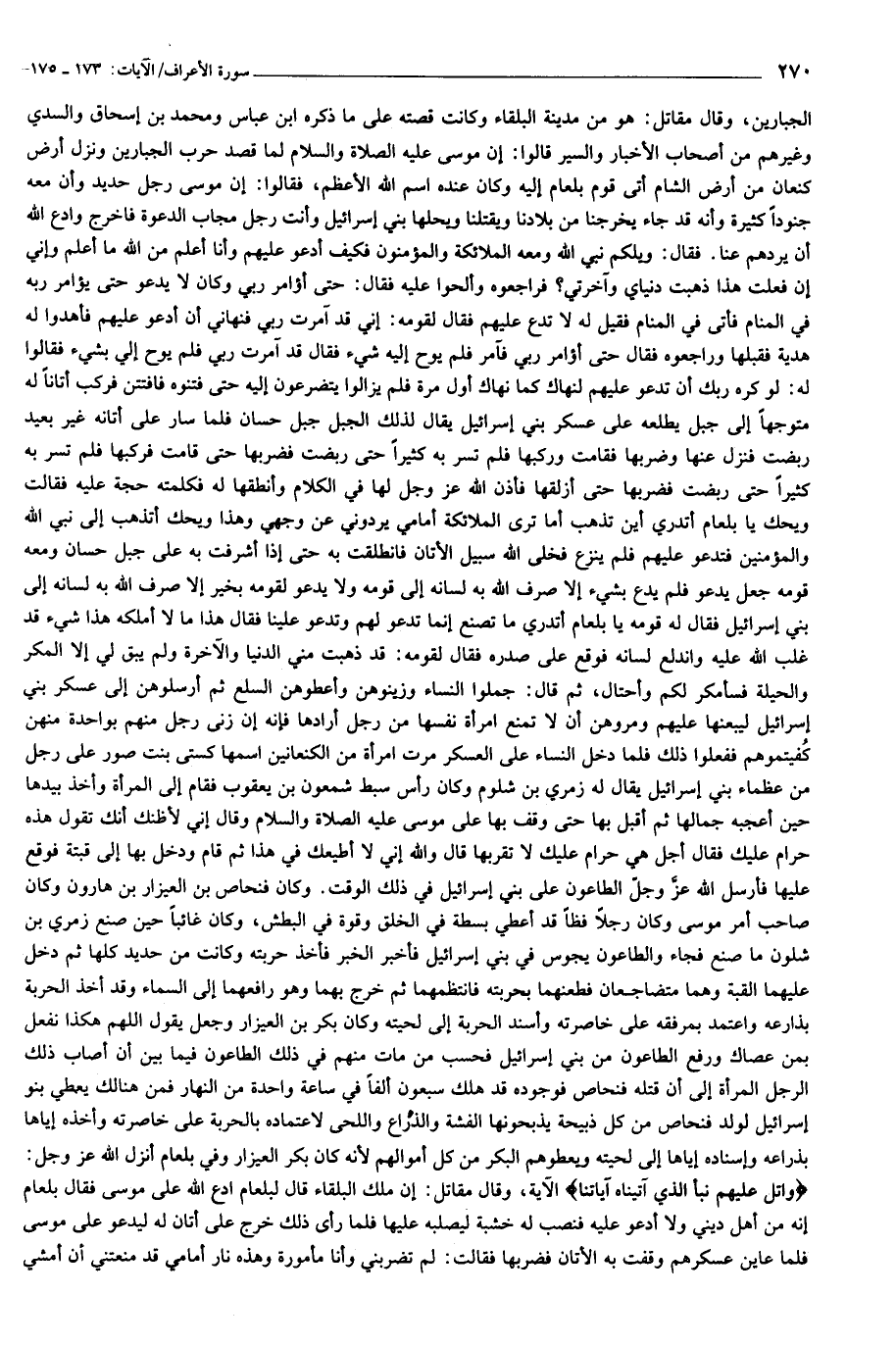 الجبارين، وقال مقاتل: هو من مدينة البلقاء وكانت قصته على ما ذكره ابن عباس ومحمد بن إسحاق والسدي وغيرهم من أصحاب الأخبار والسير قالوا: إن موسى عليه الصلاة والسلام لما قصد حرب الجبارين ونزل أرض كنعان من أرض الشام أتى قوم بلعام إليه وكان عنده اسم الله الأعظم، فقالوا: إن موسى رجل حديد وأن معه جنودا كثيرة وأنه قد جاء يخرجنا من بلادنا ويقتلنا ويحلها بني إسرائيل وأنت رجل مجاب الدعوة فاخرج وادع الله أن يردهم عنا. فقال: ويلكم نبي الله ومعه الملائكة والمؤمنون فكيف أدعو عليهم وأنا أعلم من الله ما أعلم وإني إن فعلت هذا ذهبت دنياي وآخرتي؟ فراجعوه وألحوا عليه فقال: حتى أؤامر ربي وكان لا يدعو حتى يؤامر ربه في المنام فأتى في المنام فقيل له لا تدع عليهم فقال لقومه: إني قد آمرت ربي فنهاني أن أدعو عليهم فأهدوا له هدية فقبلها وراجعوه فقال حتى أؤامر ربي فآمر فلم يوح إليه شيء فقال قد آمرت ربي فلم يوح إلي بشيء فقالوا له: لو كره ربك أن تدعو عليهم لنهاك كما نهاك أول مرة فلم يزالوا يتضرعون إليه حتى فتنوه فافتتن فركب أتانا له متوجها إلى جبل يطلعه على عسكر بني إسرائيل يقال لذلك الجبل جبل حسان فلما سار على أتانه غير بعيد ربضت فنزل عنها وضربها فقامت وركبها فلم تسر به كثيرا حتى ربضت فضربها حتى قامت فركبها فلم تسر به كثيرا حتى ربضت فضربها حتى أزلقها فأذن الله عز وجل لها في الكلام وأنطقها له فكلمته حجة عليه فقالت ويحك يا بلعام أتدري أين تذهب أما ترى الملائكة أمامي يردوني عن وجهي وهذا ويحك أتذهب إلى نبي الله والمؤمنين فتدعو عليهم فلم ينزع فخلى الله سبيل الأتان فانطلقت به حتى إذا أشرفت به على جبل حسان ومعه قومه جعل يدعو فلم يدع بشيء إلا صرف الله به لسانه إلى قومه ولا يدعو لقومه بخير إلا صرف الله به لسانه إلى بني إسرائيل فقال له قومه يا بلعام أتدري ما تصنع إنما تدعو لهم وتدعو علينا فقال هذا ما لا أملكه هذا شيء قد غلب الله عليه واندلع لسانه فوقع على صدره فقال لقومه: قد ذهبت مني الدنيا والآخرة ولم يبق لي إلا المكر والحيلة فسأمكر لكم وأحتال، ثم قال: جملوا النساء وزينوهن وأعطوهن السلع ثم أرسلوهن إلى عسكر بني إسرائيل ليبعنها عليهم ومروهن أن لا تمنع امرأة نفسها من رجل أرادها فإنه إن زنى رجل منهم بواحدة منهن كفيتموهم ففعلوا ذلك فلما دخل النساء على العسكر مرت امرأة من الكنعانيين اسمها كستي بنت صور على رجل من عظماء بني إسرائيل يقال له زمري بن شلوم وكان رأس سبط شمعون بن يعقوب فقام إلى المرأة وأخذ بيدها حين أعجبه جمالها ثم أقبل بها حتى وقف بها على موسى عليه الصلاة والسلام وقال إني لأظنك أنك تقول هذه حرام عليك فقال أجل هي حرام عليك لا تقربها قال والله إني لا أطيعك في هذا ثم قام ودخل بها إلى قبته فوقع عليها فأرسل الله عزّ وجلّ الطاعون على بني إسرائيل في ذلك الوقت. وكان فنحاص بن العيزار بن هارون وكان صاحب أمر موسى وكان رجلا فظا قد أعطي بسطة في الخلق وقوة في البطش، وكان غائبا حين صنع زمري بن شلون ما صنع فجاء والطاعون يجوس في بني إسرائيل فأخبر الخبر فأخذ حربته وكانت من حديد كلها ثم دخل عليهما القبة وهما متضاجعان فطعنهما بحربته فانتظمهما ثم خرج بهما وهو رافعهما إلى السماء وقد أخذ الحربة بذارعه واعتمد بمرفقه على خاصرته وأسند الحربة إلى لحيته وكان بكر بن العيزار وجعل يقول اللهم هكذا نفعل بمن عصاك ورفع الطاعون من بني إسرائيل فحسب من مات منهم في ذلك الطاعون فيما بين أن أصاب ذلك الرجل المرأة إلى أن