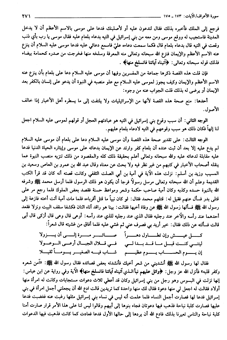 الوجه الثالث: على تقدير صحة هذه القصة وأن موسى عليه السلام دعا على بلعام أن موسى عليه السلام لم يدع عليه إلا بعد أن ثبت عنده أن بلعام كفر وارتد عن الإيمان بدعائه على موسى وإيثاره الحياة الدنيا فدعا عليه مقابلة لدعائه عليه والله سبحانه وتعالى أعلم بحقيقة ذلك كله والمقصود من ذلك تنزيه منصب النبوة عما ينقله أصحاب الأخبار في كتبهم من غير نظر فيه ولا بحث عن معناه وقال عبد الله بن عمرو بن العاص وسعيد بن المسيب وزيد بن أسلم: نزلت هذه الآية في أمية بن أبي الصلت الثقفي وكانت قصته أنه كان قد قرأ الكتب القديمة وعلم أن الله سبحانه وتعالى مرسل رسولا فرجا أن يكون هو ذلك الرسول فلما أرسل محمد صلى الله عليه وسلم وشرفه الله بالنبوة حسده وكذبه وكان أمية صاحب حكمة وشعر ومواعظ حسنة فقصد بعض الملوك فلما رجع مر على قتلى بدر فسأل عنهم فقيل له: قتلهم محمد فقال: لو كان نبيا ما قتل أقرباءه فلما مات أمية أتت أخته فازعة إلى رسول الله صلى الله عليه وسلم فسألها رسول الله صلى الله عليه وسلم عن وفاة أخيها فقالت: بينا هو راقد أتاه اثنان فكشفا سقف البيت ونزلا فقعد أحدهما عند رأسه والآخر عند رجليه فقال الذي عند رجليه للذي عند رأسه: أوعى قال وعى قال أزكى قال أبي قالت فسألته عن ذلك فقال: خير أريد بي فصرف عني ثم غشي عليه فلما أفاق من غشيته قال شعرا: