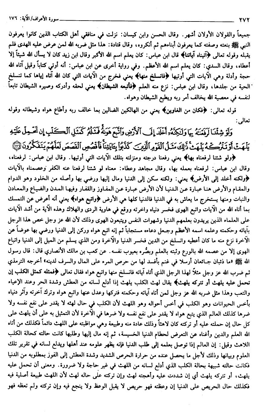 وَلَوْ شِئْنا لَرَفَعْناهُ بِها يعني رفعنا درجته ومنزلته بتلك الآيات التي أوتيها. وقال ابن عباس: لرفعناه، وقال ابن عباس: لرفعناه بعمله بها، وقال مجاهد وعطاء: معناه لو شئنا لرفعنا عنه الكفر وعصمناه بالآيات وَلكِنَّهُ أَخْلَدَ إِلَى الْأَرْضِ يعني: ولكنه سكن إلى الدنيا ومال إليها ورضي بها وأصله من الخلود وهو الدوام والمقام والأرض هنا عبارة عن الدنيا لأن الأرض عبارة عن المفاوز والقفار وفيها المدن والضياع والمعادن والنبات ومنها يستخرج ما يعاش به في الدنيا فالدنيا كلها هي الأرض وَاتَّبَعَ هَواهُ يعني أنه أعرض عن التمسك بما أتاه الله من الآيات واتبع الهوى فخسر دنياه وأخرته ووقع في هاوية الردى والهلاك وهذه الآية من أشد الآيات على العلماء الذين يريدون بعلمهم الدنيا وشهوات النفس ويتبعون الهوى وذلك لأن الله عز وجل خص هذا الرجل بآياته وحكمته وعلمه اسمه الأعظم وجعل دعاءه مستجابا ثم إنه اتبع هواه وركن إلى الدنيا ورضي بها عوضا عن الآخرة نزع منه ما كان أعطيه وانسلخ من الدين فخسر الدنيا والآخرة ومن الذي يسلم من الميل إلى الدنيا واتباع الهوى إلا من عصمه الله بالورع وثبته بالعلم وبصّره بعيوب نفسه. عن كعب بن مالك الأنصاري قال: قال رسول الله صلى الله عليه وسلم «ما ذئبان جائعان أرسلا في غنم بأفسد لها من حرص المرء على المال والسرف لدينه» أخرجه الترمذي ثم ضرب الله عز وجل مثلا لهذا الرجل الذي أتاه آياته فانسلخ منها واتبع هواه فقال تعالى فَمَثَلُهُ كَمَثَلِ الْكَلْبِ إِنْ تَحْمِلْ عَلَيْهِ يَلْهَثْ أَوْ تَتْرُكْهُ يَلْهَثْ يقال لهث الكلب يلهث إذا أدلع لسانه من العطش وشدة الحر وعند الإعياء والتعب وهذا مثل ضربه الله عز وجل لمن أتاه آياته وحكمته فتركها وعدل عنها واتبع هواه وترك آخرته وآثر دنياه بأخس الحيوانات وهو الكلب في أخس أحواله وهو اللهث لأن الكلب في حال لهثه لا يقدر على نفع نفسه ولا ضرها كذلك العالم الذي يتبع هواه لا يقدر على نفع نفسه ولا ضرها في الآخرة لأن التمثيل به على أن يلهث على كل حال إن حملته عليه أو تركته كان لاهثا وذلك عادة منه وطبيعة وهي مواظبته على اللهث دائما فكذلك من أتاه الله العلم والدين وأغناه عن التعرض لحطام الدنيا الخسيسة، ثم إنه مال إليها وطلبها كانت حالته كحالة الكلب اللاهث وقيل: إن العالم إذا توصل بعلمه إلى طلب الدنيا فإنه يظهر علومه عند أهلها ويدلع لسانه في تقرير تلك العلوم وبيانها وذلك لأجل ما يحصل عنده من حرارة الحرص الشديد وشدة العطش إلى الفوز بمطلوبه من الدنيا فكانت حالته شبيهة بحالة الكلب الذي أدلع لسانه من اللهث في غير حاجة ولا ضرورة. ومعنى أن تحمل عليه يلهث، أو تتركه يلهث أي إن شددت عليه وأهجته لهث وإن تركته على حاله لهث لأن اللهث طبيعة أصلية فيه فكذلك حال الحريص على الدنيا إن وعظته فهو حريص لا يقبل الوعظ ولا ينجع فيه وإن تركته ولم تعظه فهو