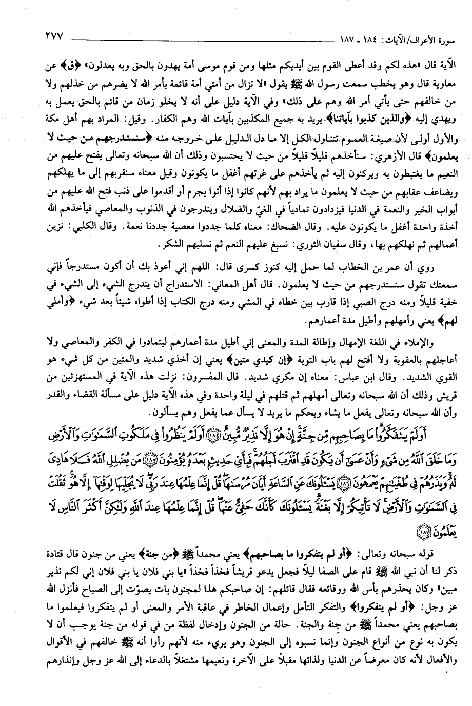 أَوَلَمْ يَتَفَكَّرُوا ما بِصاحِبِهِمْ مِنْ جِنَّةٍ إِنْ هُوَ إِلاَّ نَذِيرٌ مُبِينٌ (184) أَوَلَمْ يَنْظُرُوا فِي مَلَكُوتِ السَّماواتِ وَالْأَرْضِ وَما خَلَقَ اللَّهُ مِنْ شَيْءٍ وَأَنْ عَسى أَنْ يَكُونَ قَدِ اقْتَرَبَ أَجَلُهُمْ فَبِأَيِّ حَدِيثٍ بَعْدَهُ يُؤْمِنُونَ (185) مَنْ يُضْلِلِ اللَّهُ فَلا هادِيَ لَهُ وَيَذَرُهُمْ فِي طُغْيانِهِمْ يَعْمَهُونَ (186) يَسْئَلُونَكَ عَنِ السَّاعَةِ أَيَّانَ مُرْساها قُلْ إِنَّما عِلْمُها عِنْدَ رَبِّي لا يُجَلِّيها لِوَقْتِها إِلاَّ هُوَ ثَقُلَتْ فِي السَّماواتِ وَالْأَرْضِ لا تَأْتِيكُمْ إِلاَّ بَغْتَةً يَسْئَلُونَكَ كَأَنَّكَ حَفِيٌّ عَنْها قُلْ إِنَّما عِلْمُها عِنْدَ اللَّهِ وَلكِنَّ أَكْثَرَ النَّاسِ لا يَعْلَمُونَ (187)