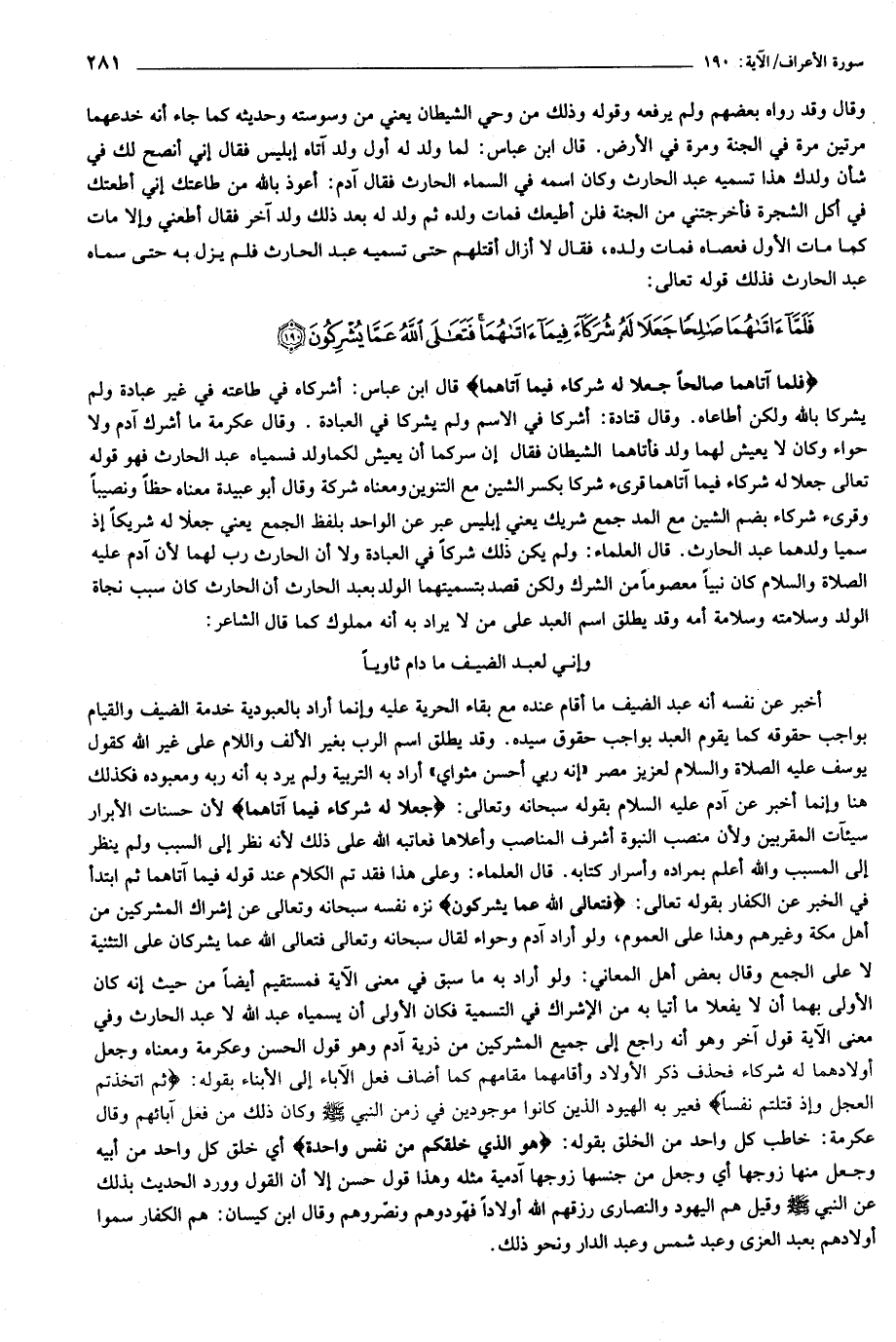 فَلَمَّا آتاهُما صالِحاً جَعَلا لَهُ شُرَكاءَ فِيما آتاهُما قال ابن عباس: أشركاه في طاعته في غير عبادة ولم يشركا بالله ولكن أطاعاه. وقال قتادة: أشركا في الاسم ولم يشركا في العبادة. وقال عكرمة ما أشرك آدم ولا حواء وكان لا يعيش لهما ولد فأتاهما الشيطان فقال إن سركما أن يعيش لكما ولد فسمياه عبد الحارث فهو قوله تعالى جعلا له شركاء فيما آتاهما قرئ شركا بكسر الشين مع التنوين ومعناه شركة وقال أبو عبيدة معناه حظا ونصيبا وقرئ شركاء بضم الشين مع المد جمع شريك يعني إبليس عبر عن الواحد بلفظ الجمع يعني جعلا له شريكا إذ سميا ولدهما عبد الحارث. قال العلماء: ولم يكن ذلك شركا في العبادة ولا أن الحارث رب لهما لأن آدم عليه الصلاة والسلام كان نبيا معصوما من الشرك ولكن قصد بتسميتهما الولد بعبد الحارث أن الحارث كان سبب نجاة الولد وسلامته وسلامة أمه وقد يطلق اسم العبد على من لا يراد به أنه مملوك كما قال الشاعر: