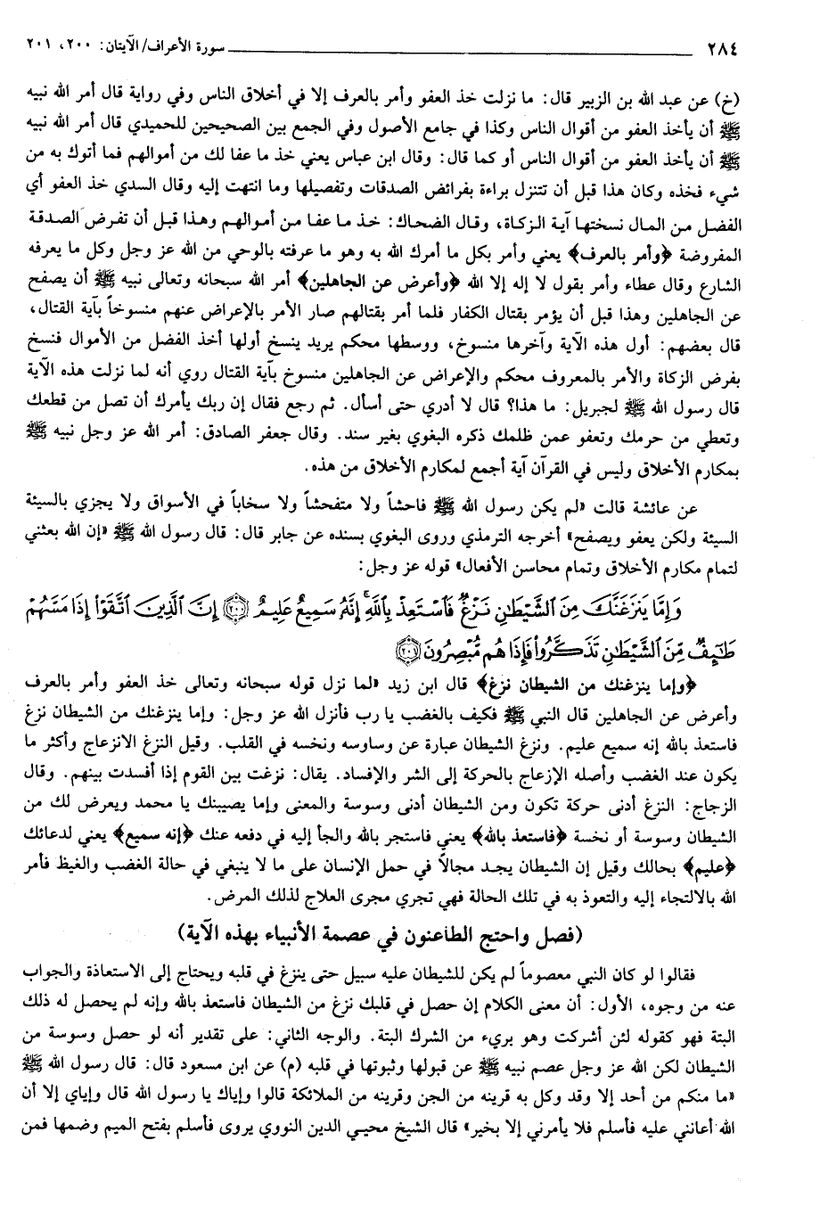 (خ) عن عبد الله بن الزبير قال: ما نزلت خذ العفو وأمر بالعرف إلا في أخلاق الناس وفي رواية قال أمر الله نبيه صلى الله عليه وسلم أن يأخذ العفو من أقوال الناس وكذا في جامع الأصول وفي الجمع بين الصحيحين للحميدي قال أمر الله نبيه صلى الله عليه وسلم أن يأخذ العفو من أقوال الناس أو كما قال: وقال ابن عباس يعني خذ ما عفا لك من أموالهم فما أتوك به من شيء فخذه وكان هذا قبل أن تتنزل براءة بفرائض الصدقات وتفصيلها وما انتهت إليه وقال السدي خذ العفو أي الفضل من المال نسختها آية الزكاة، وقال الضحاك: خذ ما عفا من أموالهم وهذا قبل أن تفرض الصدقة المفروضة وَأْمُرْ بِالْعُرْفِ يعني وأمر بكل ما أمرك الله به وهو ما عرفته بالوحي من الله عز وجل وكل ما يعرفه الشارع وقال عطاء وأمر بقول لا إله إلا الله وَأَعْرِضْ عَنِ الْجاهِلِينَ أمر الله سبحانه وتعالى نبيه صلى الله عليه وسلم أن يصفح عن الجاهلين وهذا قبل أن يؤمر بقتال الكفار فلما أمر بقتالهم صار الأمر بالإعراض عنهم منسوخا بآية القتال، قال بعضهم: أول هذه الآية وآخرها منسوخ، ووسطها محكم يريد ينسخ أولها أخذ الفضل من الأموال فنسخ بفرض الزكاة والأمر بالمعروف محكم والإعراض عن الجاهلين منسوخ بآية القتال روي أنه لما نزلت هذه الآية قال رسول الله صلى الله عليه وسلم لجبريل: ما هذا؟ قال لا أدري حتى أسأل. ثم رجع فقال إن ربك يأمرك أن تصل من قطعك وتعطي من حرمك وتعفو عمن ظلمك ذكره البغوي بغير سند. وقال جعفر الصادق: أمر الله عز وجل نبيه صلى الله عليه وسلم بمكارم الأخلاق وليس في القرآن آية أجمع لمكارم الأخلاق من هذه.