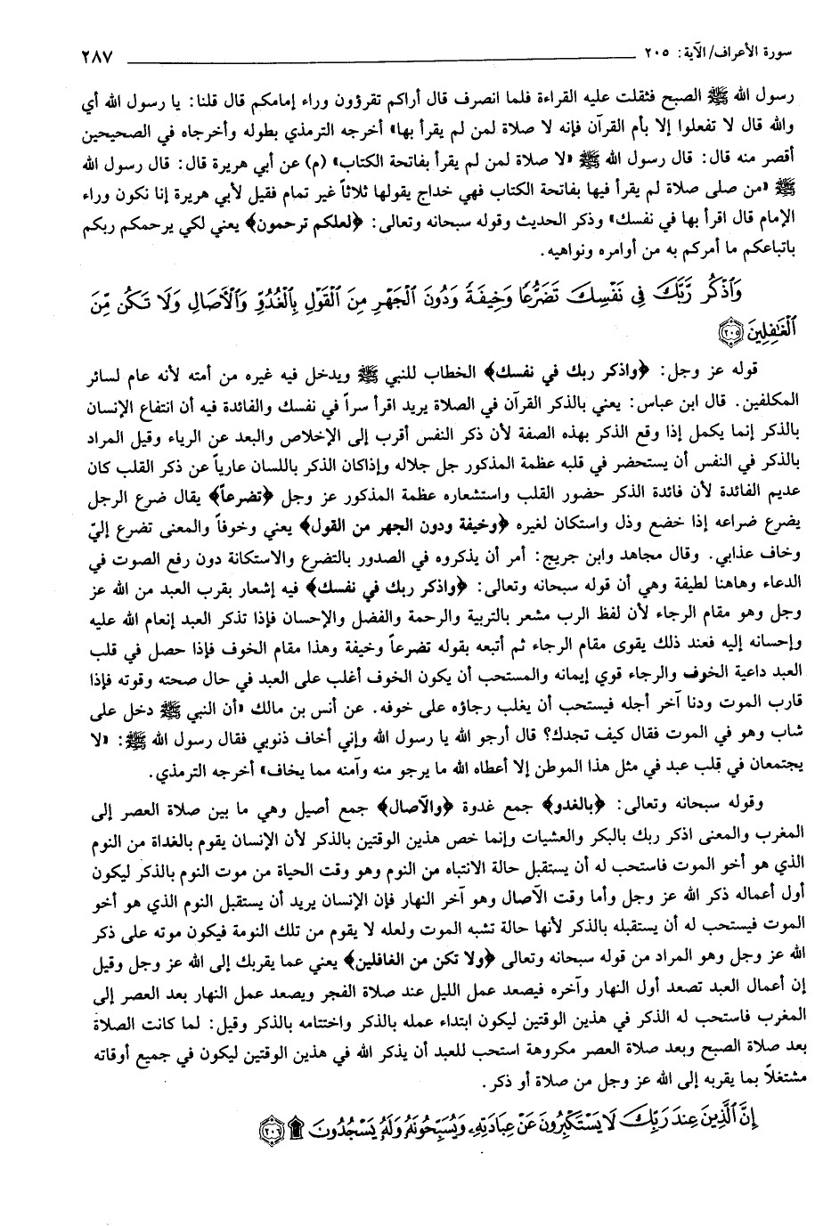 وَاذْكُرْ رَبَّكَ فِي نَفْسِكَ تَضَرُّعاً وَخِيفَةً وَدُونَ الْجَهْرِ مِنَ الْقَوْلِ بِالْغُدُوِّ وَالْآصالِ وَلا تَكُنْ مِنَ الْغافِلِينَ (205)
