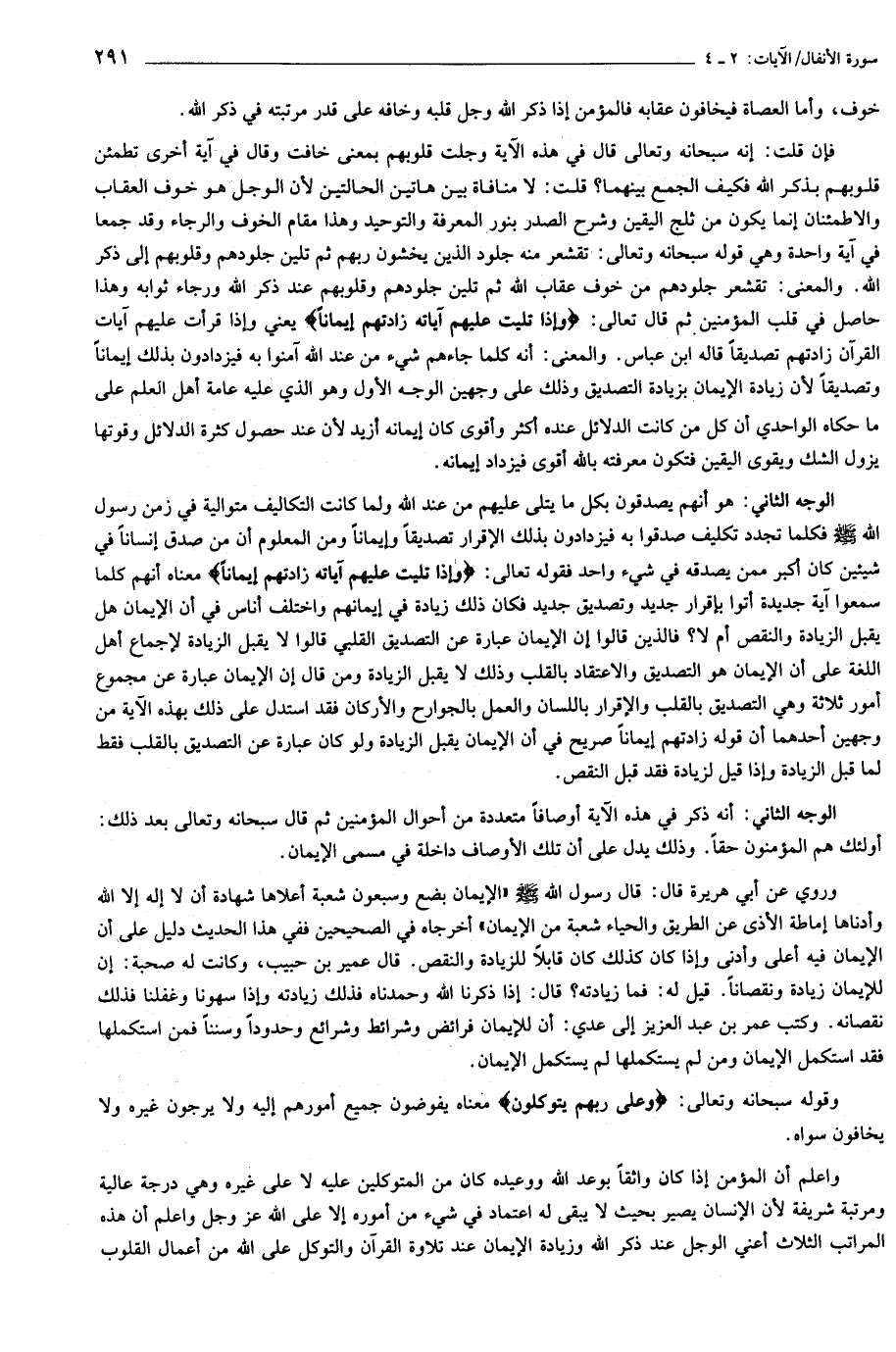 الوجه الثاني: هو أنهم يصدقون بكل ما يتلى عليهم من عند الله ولما كانت التكاليف متوالية في زمن رسول الله صلى الله عليه وسلم فكلما تجدد تكليف صدقوا به فيزدادون بذلك الإقرار تصديقا وإيمانا ومن المعلوم أن من صدق إنسانا في شيئين كان أكبر ممن يصدقه في شيء واحد فقوله تعالى: وَإِذا تُلِيَتْ عَلَيْهِمْ آياتُهُ زادَتْهُمْ إِيماناً معناه أنهم كلما سمعوا آية جديدة أتوا بإقرار جديد وتصديق جديد فكان ذلك زيادة في إيمانهم واختلف أناس في أن الإيمان هل يقبل الزيادة والنقص أم لا؟ فالذين قالوا إن الإيمان عبارة عن التصديق القلبي قالوا لا يقبل الزيادة لإجماع أهل اللغة على أن الإيمان هو التصديق والاعتقاد بالقلب وذلك لا يقبل الزيادة ومن قال إن الإيمان عبارة عن مجموع أمور ثلاثة وهي التصديق بالقلب والإقرار باللسان والعمل بالجوارح والأركان فقد استدل على ذلك بهذه الآية من وجهين أحدهما أن قوله زادتهم إيمانا صريح في أن الإيمان يقبل الزيادة ولو كان عبارة عن التصديق بالقلب فقط لما قبل الزيادة وإذا قيل لزيادة فقد قبل النقص.
