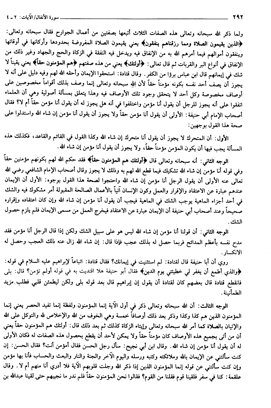 الوجه الثالث: أن الله سبحانه وتعالى ذكر في أول الآية إنما المؤمنون ولفظة إنما تفيد الحصر يعني إنما المؤمنون الذين هم كذا وكذا وذكر بعد ذلك أوصافا خمسة وهي الخوف من الله والإخلاص لله والتوكل على الله والإتيان بالصلاة كما أمر الله سبحانه وتعالى وإيتاء الزكاة كذلك ثم بعد ذلك قال: أولئك هم المؤمنون حقا يعني أن من أتى بجميع هذه الأوصاف كان مؤمنا حقا ولا يمكن لأحد أن يقطع بحصول هذه الصفات له فكان الأولى له أن يقول أنا مؤمن إن شاء الله. وقال ابن أبي نجيح: سأل رجل الحسن فقال أمؤمن أنت؟ فقال الحسن: إن كنت سألتني عن الإيمان بالله وملائكته وكتبه ورسله واليوم الآخر والجنة والنار والبعث والحساب فأنا بها مؤمن وإن كنت سألتني عن قوله إنما المؤمنون الذين إذا ذكر الله وجلت قلوبهم الآية فلا أدري أنا منهم أم لا. وقال علقمة: كنا في سفر فلقينا قوم فقلنا من القوم؟ فقالوا نحن المؤمنون حقا فلم ندر ما نجيبهم حتى لقينا عبد الله بن