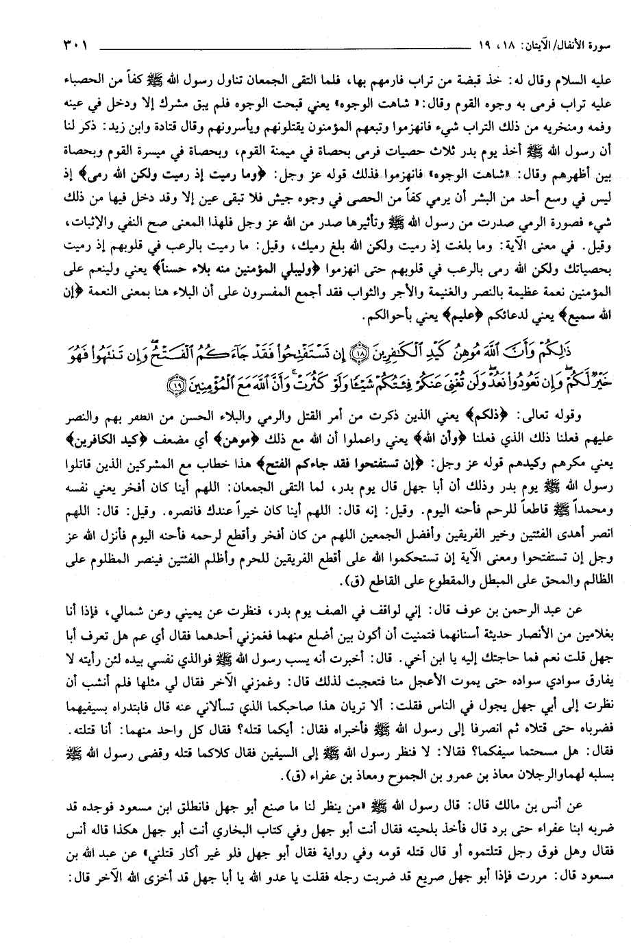 ذلِكُمْ وَأَنَّ اللَّهَ مُوهِنُ كَيْدِ الْكافِرِينَ (18) إِنْ تَسْتَفْتِحُوا فَقَدْ جاءَكُمُ الْفَتْحُ وَإِنْ تَنْتَهُوا فَهُوَ خَيْرٌ لَكُمْ وَإِنْ تَعُودُوا نَعُدْ وَلَنْ تُغْنِيَ عَنْكُمْ فِئَتُكُمْ شَيْئاً وَلَوْ كَثُرَتْ وَأَنَّ اللَّهَ مَعَ الْمُؤْمِنِينَ (19)