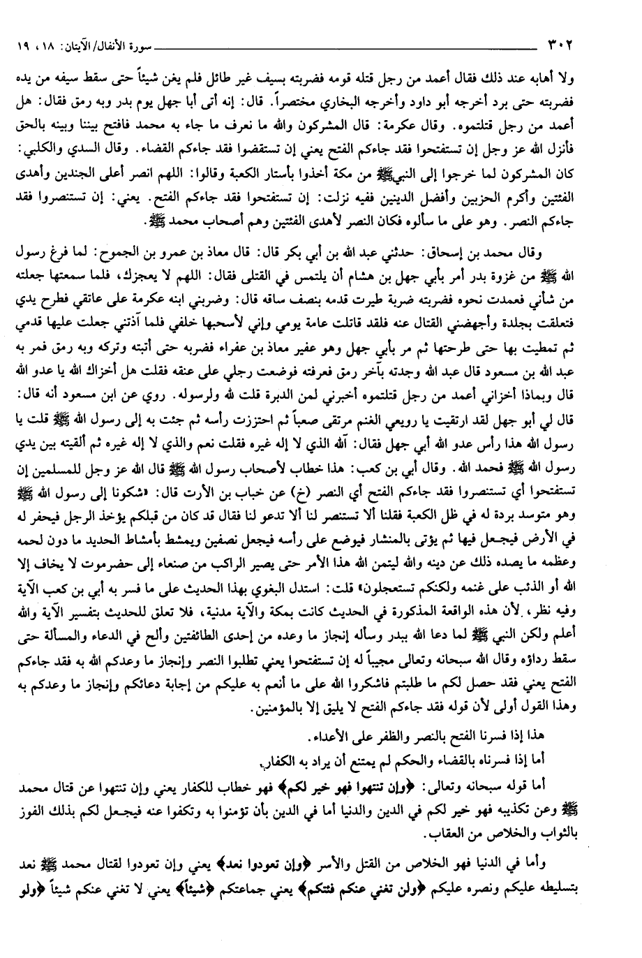 قال لي أبو جهل لقد ارتقيت يا رويعي الغنم مرتقى صعبا ثم احتززت رأسه ثم جئت به إلى رسول الله صلى الله عليه وسلم قلت يا رسول الله هذا رأس عدو الله أبي جهل فقال: آلله الذي لا إله غيره فقلت نعم والذي لا إله غيره ثم ألقيته بين يدي رسول الله صلى الله عليه وسلم فحمد الله. وقال أبي بن كعب: هذا خطاب لأصحاب رسول الله صلى الله عليه وسلم قال الله عز وجل للمسلمين إن تستفتحوا أي تستنصروا فقد جاءكم الفتح أي النصر (خ) عن خباب بن الأرت قال: «شكونا إلى رسول الله صلى الله عليه وسلم وهو متوسد بردة له في ظل الكعبة فقلنا ألا تستنصر لنا ألا تدعو لنا فقال قد كان من قبلكم يؤخذ الرجل فيحفر له في الأرض فيجعل فيها ثم يؤتى بالمنشار فيوضع على رأسه فيجعل نصفين ويمشط بأمشاط الحديد ما دون لحمه وعظمه ما يصده ذلك عن دينه والله ليتمن الله هذا الأمر حتى يصير الراكب من صنعاء إلى حضرموت لا يخاف إلا الله أو الذئب على غنمه ولكنكم تستعجلون» قلت: استدل البغوي بهذا الحديث على ما فسر به أبي بن كعب الآية وفيه نظر، لأن هذه الواقعة المذكورة في الحديث كانت بمكة والآية مدنية، فلا تعلق للحديث بتفسير الآية والله أعلم ولكن النبي صلى الله عليه وسلم لما دعا الله ببدر وسأله إنجاز ما وعده من إحدى الطائفتين وألح في الدعاء والمسألة حتى سقط رداؤه وقال الله سبحانه وتعالى مجيبا له إن تستفتحوا يعني تطلبوا النصر وإنجاز ما وعدكم الله به فقد جاءكم الفتح يعني فقد حصل لكم ما طلبتم فاشكروا الله على ما أنعم به عليكم من إجابة دعائكم وإنجاز ما وعدكم به وهذا القول أولى لأن قوله فقد جاءكم الفتح لا يليق إلا بالمؤمنين.