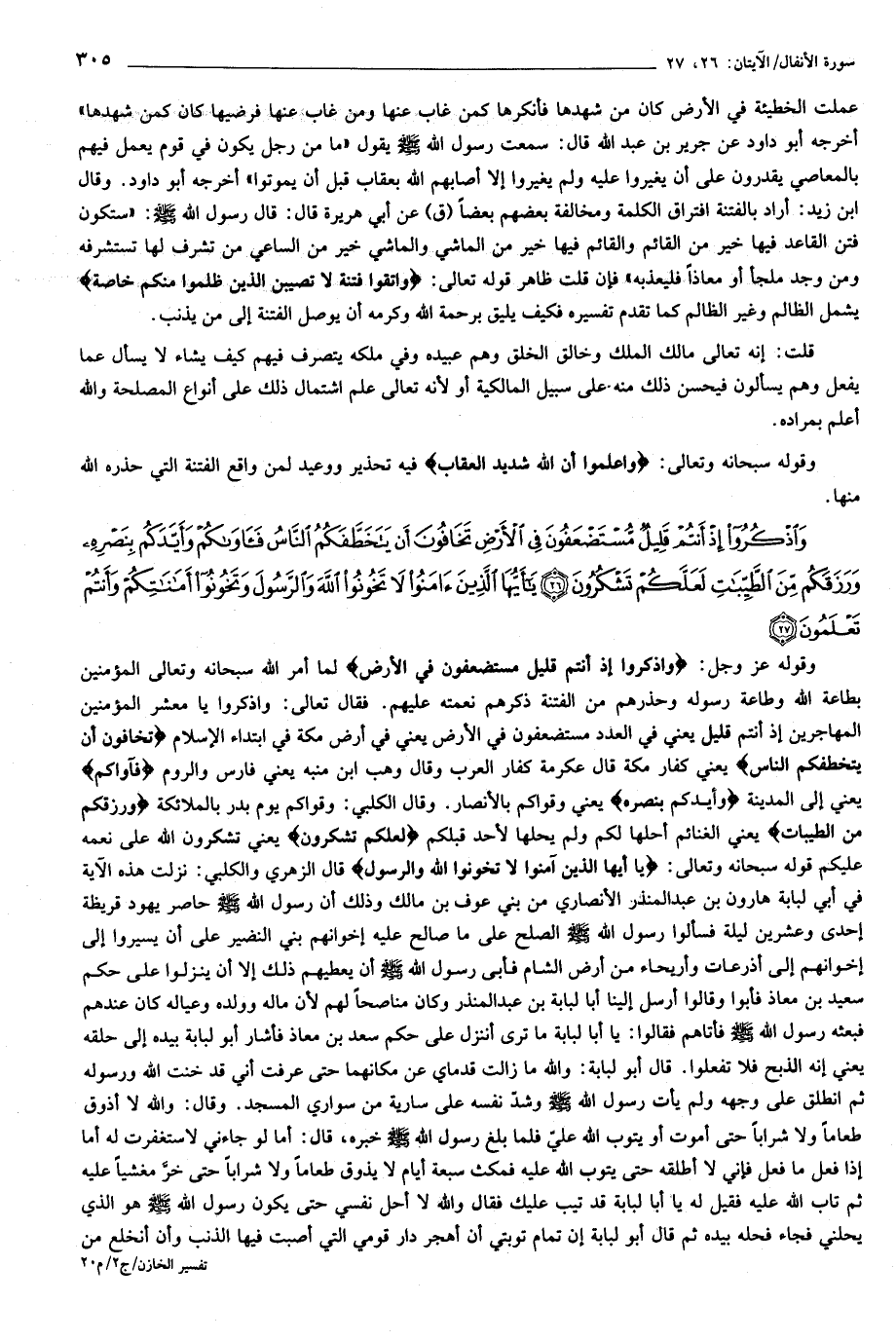 وقوله عز وجل: وَاذْكُرُوا إِذْ أَنْتُمْ قَلِيلٌ مُسْتَضْعَفُونَ فِي الْأَرْضِ لما أمر الله سبحانه وتعالى المؤمنين بطاعة الله وطاعة رسوله وحذرهم من الفتنة ذكرهم نعمته عليهم. فقال تعالى: واذكروا يا معشر المؤمنين المهاجرين إذ أنتم قليل يعني في العدد مستضعفون في الأرض يعني في أرض مكة في ابتداء الإسلام تَخافُونَ أَنْ يَتَخَطَّفَكُمُ النَّاسُ يعني كفار مكة قال عكرمة كفار العرب وقال وهب ابن منبه يعني فارس والروم فَآواكُمْ يعني إلى المدينة وَأَيَّدَكُمْ بِنَصْرِهِ يعني وقواكم بالأنصار. وقال الكلبي: وقواكم يوم بدر بالملائكة وَرَزَقَكُمْ مِنَ الطَّيِّباتِ يعني الغنائم أحلها لكم ولم يحلها لأحد قبلكم لَعَلَّكُمْ تَشْكُرُونَ يعني تشكرون الله على نعمه عليكم قوله سبحانه وتعالى: يا أَيُّهَا الَّذِينَ آمَنُوا لا تَخُونُوا اللَّهَ وَالرَّسُولَ قال الزهري والكلبي: نزلت هذه الآية في أبي لبابة هارون بن عبد المنذر الأنصاري من بني عوف بن مالك وذلك أن رسول الله صلى الله عليه وسلم حاصر يهود قريظة إحدى وعشرين ليلة فسألوا رسول الله صلى الله عليه وسلم الصلح على ما صالح عليه إخوانهم بني النضير على أن يسيروا إلى إخوانهم إلى أذرعات وأريحاء من أرض الشام فأبى رسول الله صلى الله عليه وسلم أن يعطيهم ذلك إلا أن ينزلوا على حكم سعيد بن معاذ فأبوا وقالوا أرسل إلينا أبا لبابة بن عبد المنذر وكان مناصحا لهم لأن ماله وولده وعياله كان عندهم فبعثه رسول الله صلى الله عليه وسلم فأتاهم فقالوا: يا أبا لبابة ما ترى أننزل على حكم سعد بن معاذ فأشار أبو لبابة بيده إلى حلقه يعني إنه الذبح فلا تفعلوا. قال أبو لبابة: والله ما زالت قدماي عن مكانهما حتى عرفت أني قد خنت الله ورسوله ثم انطلق على وجهه ولم يأت رسول الله صلى الله عليه وسلم وشدّ نفسه على سارية من سواري المسجد. وقال: والله لا أذوق طعاما ولا شرابا حتى أموت أو يتوب الله عليّ فلما بلغ رسول الله صلى الله عليه وسلم خبره، قال: أما لو جاءني لاستغفرت له أما إذا فعل ما فعل فإني لا أطلقه حتى يتوب الله عليه فمكث سبعة أيام لا يذوق طعاما ولا شرابا حتى خرّ مغشيا عليه ثم تاب الله عليه فقيل له يا أبا لبابة قد تيب عليك فقال والله لا أحل نفسي حتى يكون رسول الله صلى الله عليه وسلم هو الذي يحلني فجاء فحله بيده ثم قال أبو لبابة إن تمام توبتي أن أهجر دار قومي التي أصبت فيها الذنب وأن أنخلع من