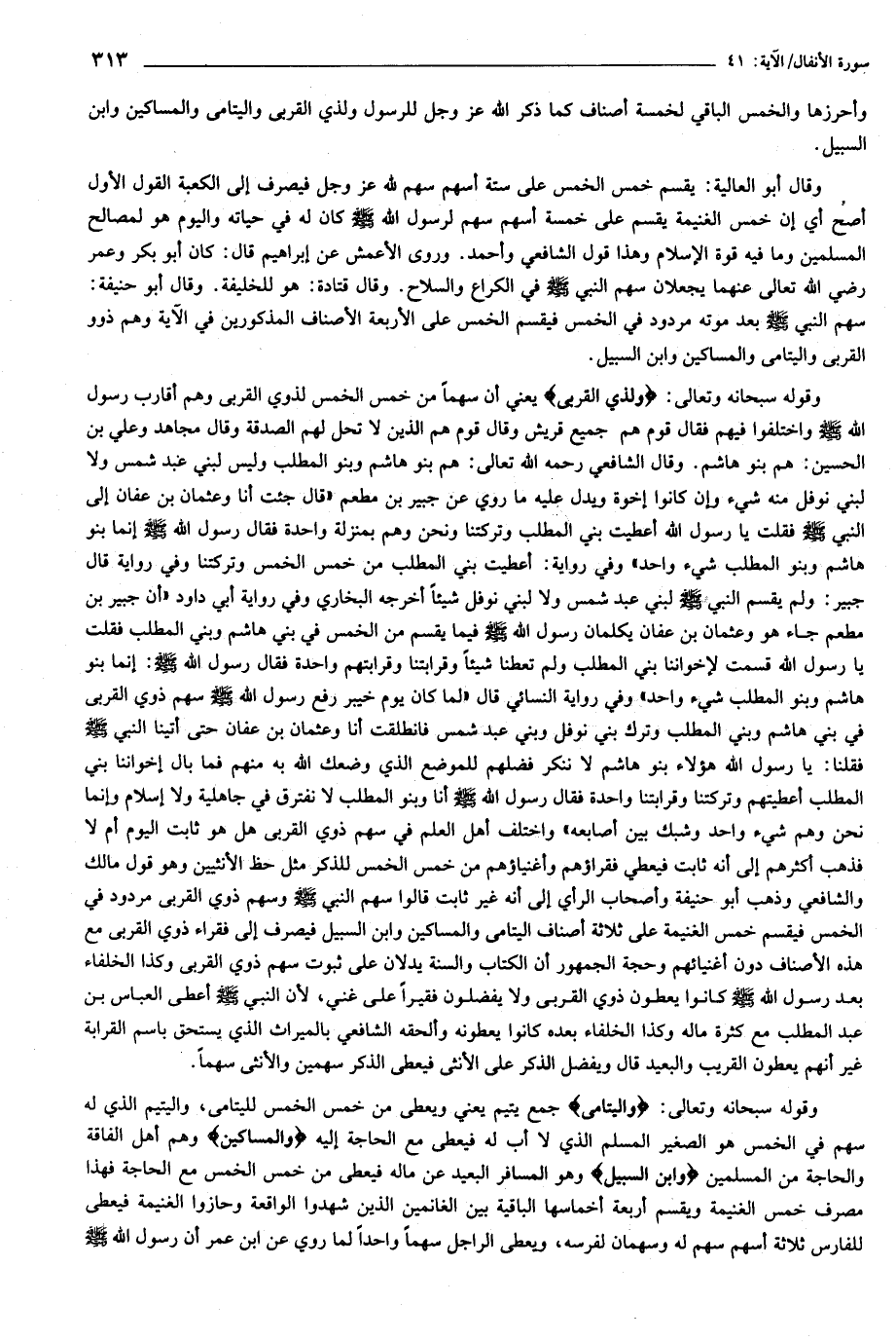 وقوله سبحانه وتعالى: وَلِذِي الْقُرْبى يعني أن سهما من خمس الخمس لذوي القربى وهم أقارب رسول الله صلى الله عليه وسلم واختلفوا فيهم فقال قوم هم جميع قريش وقال قوم هم الذين لا تحل لهم الصدقة وقال مجاهد وعلي بن الحسين: هم بنو هاشم. وقال الشافعي رحمه الله تعالى: هم بنو هاشم وبنو المطلب وليس لبني عبد شمس ولا لبني نوفل منه شيء وإن كانوا إخوة ويدل عليه ما روي عن جبير بن مطعم «قال جئت أنا وعثمان بن عفان إلى النبي صلى الله عليه وسلم فقلت يا رسول الله أعطيت بني المطلب وتركتنا ونحن وهم بمنزلة واحدة فقال رسول الله صلى الله عليه وسلم إنما بنو هاشم وبنو المطلب شيء واحد» وفي رواية: أعطيت بني المطلب من خمس الخمس وتركتنا وفي رواية قال جبير: ولم يقسم النبي صلى الله عليه وسلم لبني عبد شمس ولا لبني نوفل شيئا أخرجه البخاري وفي رواية أبي داود «أن جبير بن مطعم جاء هو وعثمان بن عفان يكلمان رسول الله صلى الله عليه وسلم فيما يقسم من الخمس في بني هاشم وبني المطلب فقلت يا رسول الله قسمت لإخواننا بني المطلب ولم تعطنا شيئا وقرابتنا وقرابتهم واحدة فقال رسول الله صلى الله عليه وسلم: إنما بنو هاشم وبنو المطلب شيء واحد» وفي رواية النسائي قال «لما كان يوم خيبر رفع رسول الله صلى الله عليه وسلم سهم ذوي القربى في بني هاشم وبني المطلب وترك بني نوفل وبني عبد شمس فانطلقت أنا وعثمان بن عفان حتى أتينا النبي صلى الله عليه وسلم فقلنا: يا رسول الله هؤلاء بنو هاشم لا ننكر فضلهم للموضع الذي وضعك الله به منهم فما بال إخواننا بني المطلب أعطيتهم وتركتنا وقرابتنا واحدة فقال رسول الله صلى الله عليه وسلم أنا وبنو المطلب لا نفترق في جاهلية ولا إسلام وإنما نحن وهم شيء واحد وشبك بين أصابعه» واختلف أهل العلم في سهم ذوي القربى هل هو ثابت اليوم أم لا فذهب أكثرهم إلى أنه ثابت فيعطي فقراؤهم وأغنياؤهم من خمس الخمس للذكر مثل حظ الأنثيين وهو قول مالك والشافعي وذهب أبو حنيفة وأصحاب الرأي إلى أنه غير ثابت قالوا سهم النبي صلى الله عليه وسلم وسهم ذوي القربى مردود في الخمس فيقسم خمس الغنيمة على ثلاثة أصناف اليتامى والمساكين وابن السبيل فيصرف إلى فقراء ذوي القربى مع هذه الأصناف دون أغنيائهم وحجة الجمهور أن الكتاب والسنة يدلان على ثبوت سهم ذوي القربى وكذا الخلفاء بعد رسول الله صلى الله عليه وسلم كانوا يعطون ذوي القربى ولا يفضلون فقيرا على غني، لأن النبي صلى الله عليه وسلم أعطى العباس بن عبد المطلب مع كثرة ماله وكذا الخلفاء بعده كانوا يعطونه وألحقه الشافعي بالميراث الذي يستحق باسم القرابة غير أنهم يعطون القريب والبعيد قال ويفضل الذكر على الأنثى فيعطى الذكر سهمين والأنثى سهما.