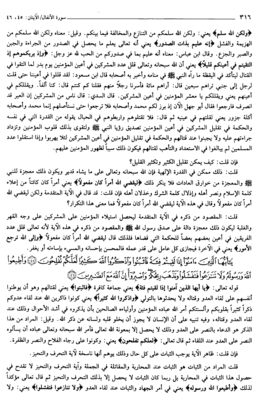قلت المراد من الثبات هو الثبات عند المحاربة والمقاتلة في الجملة وآية التحرف والتحيز لا تقدح في حصول هذا الثبات في المحاربة بل ربما كان الثبات لا يحصل إلا بذلك التحرف والتحيز ثم قال تعالى مؤكدا لذلك وَأَطِيعُوا اللَّهَ وَرَسُولَهُ يعني في أمر الجهاد والثبات عند لقاء العدو وَلا تَنازَعُوا فَتَفْشَلُوا يعني: ولا