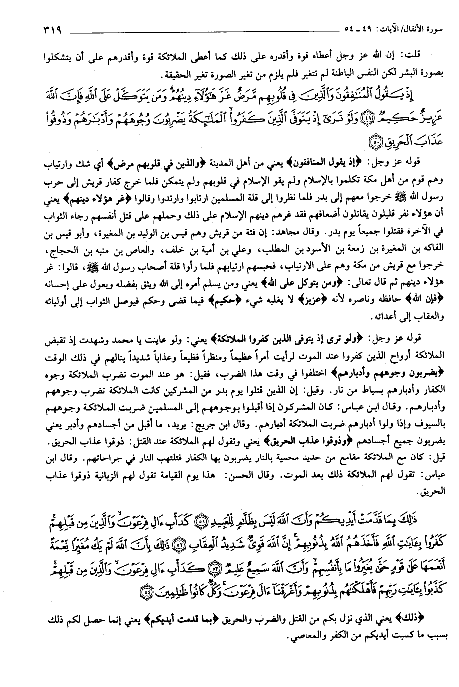 إِذْ يَقُولُ الْمُنافِقُونَ وَالَّذِينَ فِي قُلُوبِهِمْ مَرَضٌ غَرَّ هؤُلاءِ دِينُهُمْ وَمَنْ يَتَوَكَّلْ عَلَى اللَّهِ فَإِنَّ اللَّهَ عَزِيزٌ حَكِيمٌ (49) وَلَوْ تَرى إِذْ يَتَوَفَّى الَّذِينَ كَفَرُوا الْمَلائِكَةُ يَضْرِبُونَ وُجُوهَهُمْ وَأَدْبارَهُمْ وَذُوقُوا عَذابَ الْحَرِيقِ (50)