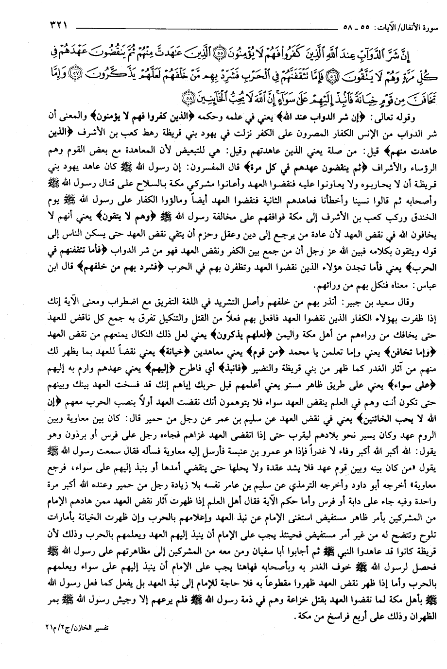 إِنَّ شَرَّ الدَّوَابِّ عِنْدَ اللَّهِ الَّذِينَ كَفَرُوا فَهُمْ لا يُؤْمِنُونَ (55) الَّذِينَ عاهَدْتَ مِنْهُمْ ثُمَّ يَنْقُضُونَ عَهْدَهُمْ فِي كُلِّ مَرَّةٍ وَهُمْ لا يَتَّقُونَ (56) فَإِمَّا تَثْقَفَنَّهُمْ فِي الْحَرْبِ فَشَرِّدْ بِهِمْ مَنْ خَلْفَهُمْ لَعَلَّهُمْ يَذَّكَّرُونَ (57) وَإِمَّا تَخافَنَّ مِنْ قَوْمٍ خِيانَةً فَانْبِذْ إِلَيْهِمْ عَلى سَواءٍ إِنَّ اللَّهَ لا يُحِبُّ الْخائِنِينَ (58)