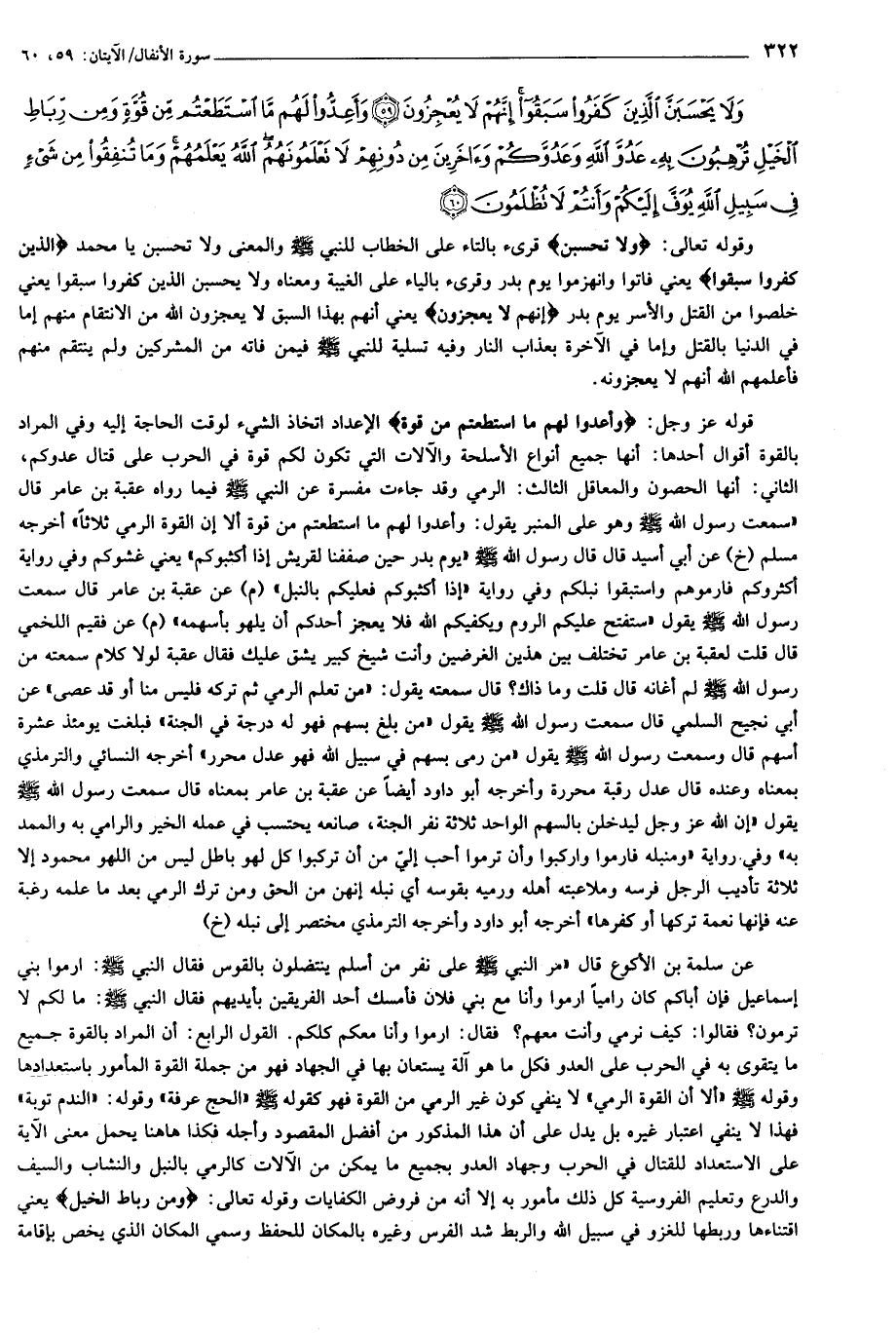 وَلا يَحْسَبَنَّ الَّذِينَ كَفَرُوا سَبَقُوا إِنَّهُمْ لا يُعْجِزُونَ (59) وَأَعِدُّوا لَهُمْ مَا اسْتَطَعْتُمْ مِنْ قُوَّةٍ وَمِنْ رِباطِ الْخَيْلِ تُرْهِبُونَ بِهِ عَدُوَّ اللَّهِ وَعَدُوَّكُمْ وَآخَرِينَ مِنْ دُونِهِمْ لا تَعْلَمُونَهُمُ اللَّهُ يَعْلَمُهُمْ وَما تُنْفِقُوا مِنْ شَيْءٍ فِي سَبِيلِ اللَّهِ يُوَفَّ إِلَيْكُمْ وَأَنْتُمْ لا تُظْلَمُونَ (60)