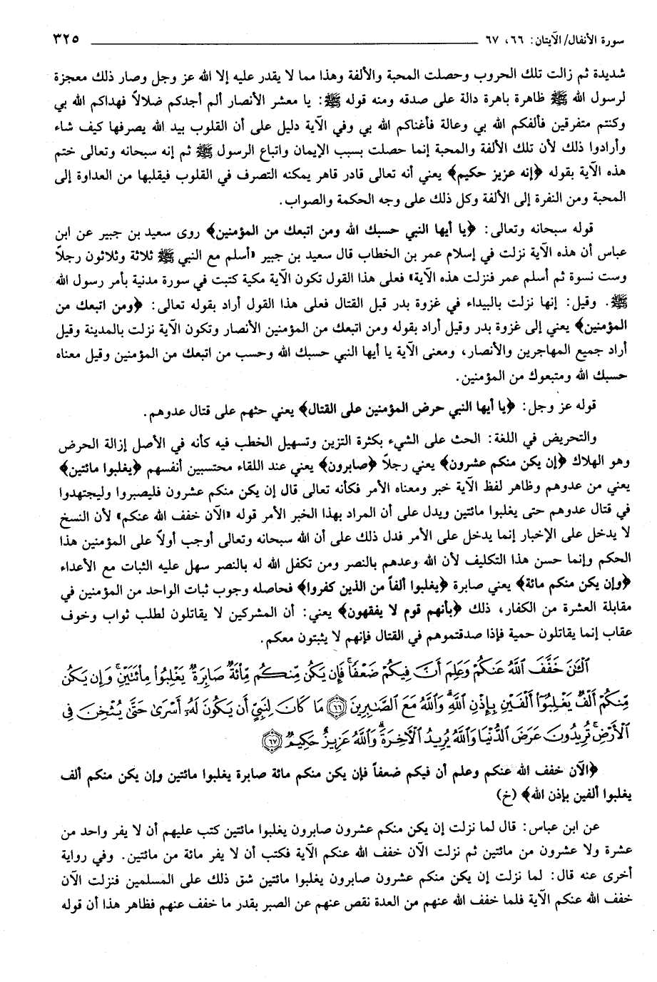 الْآنَ خَفَّفَ اللَّهُ عَنْكُمْ وَعَلِمَ أَنَّ فِيكُمْ ضَعْفاً فَإِنْ يَكُنْ مِنْكُمْ مِائَةٌ صابِرَةٌ يَغْلِبُوا مِائَتَيْنِ وَإِنْ يَكُنْ مِنْكُمْ أَلْفٌ يَغْلِبُوا أَلْفَيْنِ بِإِذْنِ اللَّهِ (خ) عن ابن عباس: قال لما نزلت إن يكن منكم عشرون صابرون يغلبوا مائتين كتب عليهم أن لا يفر واحد من عشرة ولا عشرون من مائتين ثم نزلت الآن خفف الله عنكم الآية فكتب أن لا يفر مائة من مائتين. وفي رواية أخرى عنه قال: لما نزلت إن يكن منكم عشرون صابرون يغلبوا مائتين شق ذلك على المسلمين فنزلت الآن خفف الله عنكم الآية فلما خفف الله عنهم من العدة نقص عنهم عن الصبر بقدر ما خفف عنهم فظاهر هذا أن قوله