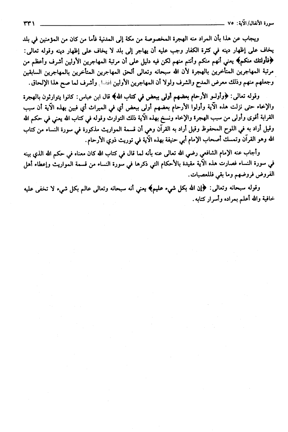 وقوله تعالى: وَأُولُوا الْأَرْحامِ بَعْضُهُمْ أَوْلى بِبَعْضٍ فِي كِتابِ اللَّهِ قال ابن عباس: كانوا يتوارثون بالهجرة والإخاء حتى نزلت هذه الآية وأولوا الأرحام بعضهم أولى ببعض أي في الميراث أي فبين بهذه الآية أن سبب القرابة أقوى وأولى من سبب الهجرة والإخاء ونسخ بهذه الآية ذلك التوارث وقوله في كتاب الله يعني في حكم الله وقيل أراد به في اللوح المحفوظ وقيل أراد به القرآن وهي أن قسمة المواريث مذكورة في سورة النساء من كتاب الله وهو القرآن وتمسك أصحاب الإمام أبي حنيفة بهذه الآية في توريث ذوي الأرحام.
