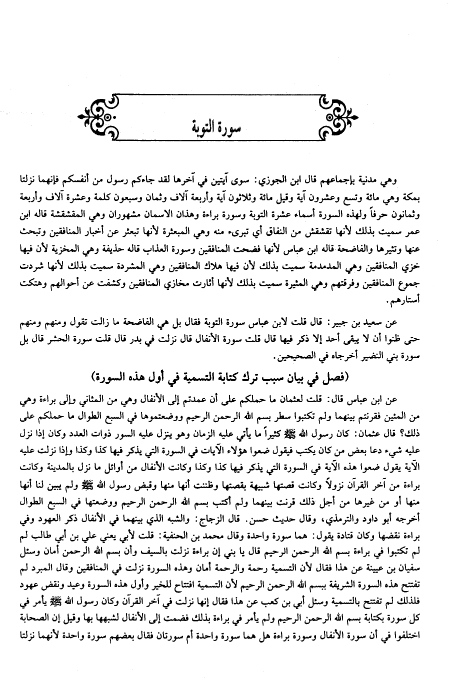((فصل في بيان سبب ترك كتابة التسمية في أول هذه السورة)) عن ابن عباس قال: قلت لعثمان ما حملكم على أن عمدتم إلى الأنفال وهي من المثاني وإلى براءة وهي من المئين فقرنتم بينهما ولم تكتبوا سطر بسم الله الرحمن الرحيم ووضعتموها في السبع الطوال ما حملكم على ذلك؟ قال عثمان: كان رسول الله صلى الله عليه وسلم كثيرا ما يأتي عليه الزمان وهو ينزل عليه السور ذوات العدد وكان إذا نزل عليه شيء دعا بعض من كان يكتب فيقول ضعوا هؤلاء الآيات في السورة التي يذكر فيها كذا وكذا وإذا نزلت عليه الآية يقول ضعوا هذه الآية في السورة التي يذكر فيها كذا وكذا وكانت الأنفال من أوائل ما نزل بالمدينة وكانت براءة من آخر القرآن نزولا وكانت قصتها شبيهة بقصتها وظننت أنها منها وقبض رسول الله صلى الله عليه وسلم ولم يبين لنا أنها منها أو من غيرها من أجل ذلك قرنت بينهما ولم أكتب بسم الله الرحمن الرحيم ووضعتها في السبع الطوال أخرجه أبو داود والترمذي، وقال حديث حسن. قال الزجاج: والشبه الذي بينهما في الأنفال ذكر العهود وفي براءة نقضها وكان قتادة يقول: هما سورة واحدة وقال محمد بن الحنفية: قلت لأبي يعني علي بن أبي طالب لم لم تكتبوا في براءة بسم الله الرحمن الرحيم قال يا بني إن براءة نزلت بالسيف وأن بسم الله الرحمن أمان وسئل سفيان بن عيينة عن هذا فقال لأن التسمية رحمة والرحمة أمان وهذه السورة نزلت في المنافقين وقال المبرد لم تفتتح هذه السورة الشريفة ببسم الله الرحمن الرحيم لأن التسمية افتتاح للخير وأول هذه السورة وعيد ونقض عهود فلذلك لم تفتتح بالتسمية وسئل أبي بن كعب عن هذا فقال إنها نزلت في آخر القرآن وكان رسول الله صلى الله عليه وسلم يأمر في كل سورة بكتابة بسم الله الرحمن الرحيم ولم يأمر في براءة بذلك فضمت إلى الأنفال لشبهها بها وقيل إن الصحابة اختلفوا في أن سورة الأنفال وسورة براءة هل هما سورة واحدة أم سورتان فقال بعضهم سورة واحدة لأنهما نزلتا
