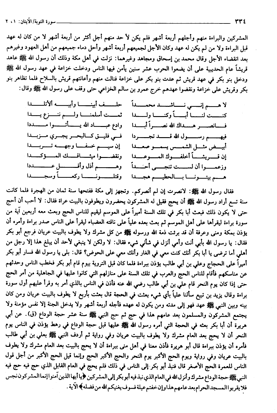 فقال رسول الله صلى الله عليه وسلم: لا نصرت إن لم أنصركم. وتجهز إلى مكة ففتحها سنة ثمان من الهجرة فلما كانت سنة تسع أراد رسول الله صلى الله عليه وسلم أن يحج فقيل له المشركون يحضرون ويطوفون بالبيت عراة فقال: لا أحب أن أحج حتى لا يكون ذلك فبعث أبا بكر في تلك السنة أميرا على الموسم ليقيم للناس الحج وبعث معه أربعين آية من سورة براءة ليقرأها على أهل الموسم ثم بعث بعده عليا على ناقته العضباء ليقرأ على الناس صدر براءة وأمره أن يؤذن بمكة ومنى وعرفة أن قد برئت ذمة الله ورسوله صلى الله عليه وسلم من كل مشرك ولا يطوف بالبيت عريان فرجع أبو بكر فقال: يا رسول الله بأبي أنت وأمي أنزل في شأني شيء فقال: لا ولكن لا ينبغي لأحد أن يبلغ هذا إلا رجل من أهلي أما ترضى يا أبا بكر أنك كنت معي في الغار وأنك معي على الحوض؟ قال: بلى يا رسول الله فسار أبو بكر أميرا على الحجاج وعلي بن أبي طالب يؤذن ببراءة فلما كان قبل التروية بيوم قام أبو بكر فخطب الناس وحدثهم عن مناسكهم فأقام للناس الحج والعرب في تلك السنة على منازلهم التي كانوا عليها في الجاهلية من أمر الحج حتى إذا كان يوم النحر قام علي بن أبي طالب رضي الله عنه فأذن في الناس بالذي أمر به وقرأ عليهم أول سورة براءة وقال يزيد بن تبيع سألنا عليا بأي شيء بعثت في الحجة قال بعثت بأربع لا يطوف بالبيت عريان ومن كان بينه وبين النبي صلى الله عليه وسلم عهد فهو إلى مدته ومن يكون له عهده فأجله أربعة أشهر ولا يدخل الجنة إلا نفس مؤمنة ولا يجتمع المشركون والمسلمون بعد عامهم هذا في حج ثم حج النبي صلى الله عليه وسلم سنة عشر حجة الوداع (ق). عن أبي هريرة أن أبا بكر بعثه في الحجة التي أمره رسول الله صلى الله عليه وسلم عليها قبل حجة الوداع (ق). عن أبي هريرة أن أبا بكر بعثه في الحجة التي أمره رسول الله صلى الله عليه وسلم عليها قبل حجة الوداع في رهط يؤذن في الناس يوم النحر أن لا يحج بعد العام مشرك ولا يطوف بالبيت عريان وفي رواية ثم أردف النبي صلى الله عليه وسلم بعلي بن أبي طالب فأمره أن يؤذن ببراءة قال أبو هريرة فأذن معنا في أهل منى ببراءة أن لا يحج بالبيت بعد العام مشرك ولا يطوف بالبيت عريان وفي رواية ويوم الحج الأكبر يوم النحر والحج الأكبر الحج وإنما قيل الحج الأكبر من أجل قول الناس للعمرة الحج الأصغر قال فنبذ أبو بكر إلى الناس في ذلك فلم يحج في العام القابل الذي حج فيه حج فيه النبي صلى الله عليه وسلم حجة الوداع مشرك وأنزل الله في العام الذي نبذ فيه أبو بكر إلى المشركين يا أَيُّهَا الَّذِينَ آمَنُوا إِنَّمَا الْمُشْرِكُونَ نَجَسٌ فَلا يَقْرَبُوا الْمَسْجِدَ الْحَرامَ بَعْدَ عامِهِمْ هذا وَإِنْ خِفْتُمْ عَيْلَةً فَسَوْفَ يُغْنِيكُمُ اللَّهُ مِنْ فَضْلِهِ الآية.