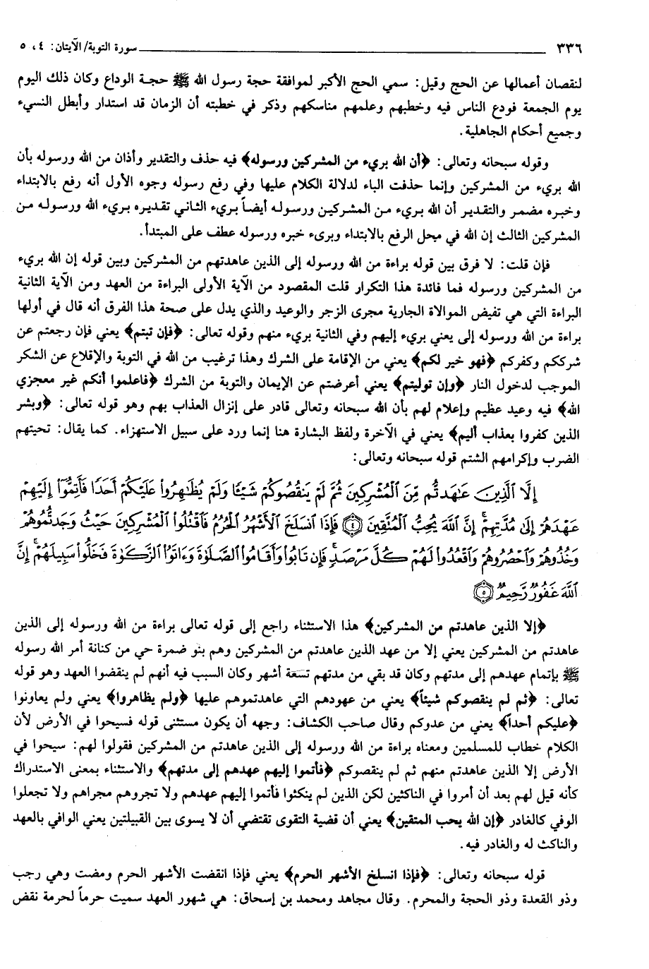 إِلاَّ الَّذِينَ عاهَدْتُمْ مِنَ الْمُشْرِكِينَ ثُمَّ لَمْ يَنْقُصُوكُمْ شَيْئاً وَلَمْ يُظاهِرُوا عَلَيْكُمْ أَحَداً فَأَتِمُّوا إِلَيْهِمْ عَهْدَهُمْ إِلى مُدَّتِهِمْ إِنَّ اللَّهَ يُحِبُّ الْمُتَّقِينَ (4) فَإِذَا انْسَلَخَ الْأَشْهُرُ الْحُرُمُ فَاقْتُلُوا الْمُشْرِكِينَ حَيْثُ وَجَدْتُمُوهُمْ وَخُذُوهُمْ وَاحْصُرُوهُمْ وَاقْعُدُوا لَهُمْ كُلَّ مَرْصَدٍ فَإِنْ تابُوا وَأَقامُوا الصَّلاةَ وَآتَوُا الزَّكاةَ فَخَلُّوا سَبِيلَهُمْ إِنَّ اللَّهَ غَفُورٌ رَحِيمٌ (5)