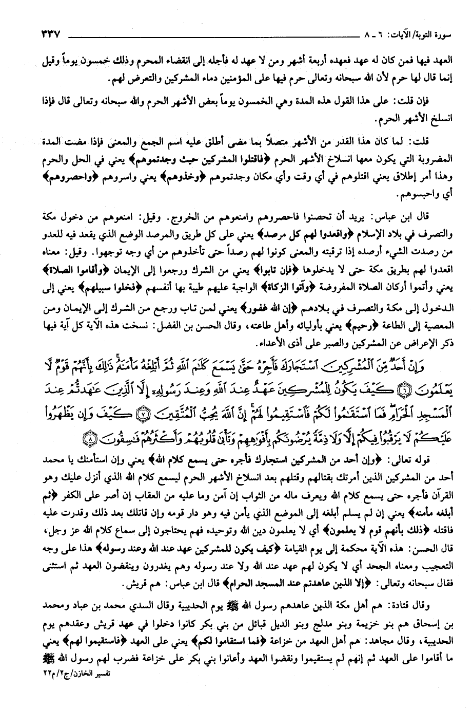 وَإِنْ أَحَدٌ مِنَ الْمُشْرِكِينَ اسْتَجارَكَ فَأَجِرْهُ حَتَّى يَسْمَعَ كَلامَ اللَّهِ ثُمَّ أَبْلِغْهُ مَأْمَنَهُ ذلِكَ بِأَنَّهُمْ قَوْمٌ لا يَعْلَمُونَ (6) كَيْفَ يَكُونُ لِلْمُشْرِكِينَ عَهْدٌ عِنْدَ اللَّهِ وَعِنْدَ رَسُولِهِ إِلاَّ الَّذِينَ عاهَدْتُمْ عِنْدَ الْمَسْجِدِ الْحَرامِ فَمَا اسْتَقامُوا لَكُمْ فَاسْتَقِيمُوا لَهُمْ إِنَّ اللَّهَ يُحِبُّ الْمُتَّقِينَ (7) كَيْفَ وَإِنْ يَظْهَرُوا عَلَيْكُمْ لا يَرْقُبُوا فِيكُمْ إِلاًّ وَلا ذِمَّةً يُرْضُونَكُمْ بِأَفْواهِهِمْ وَتَأْبى قُلُوبُهُمْ وَأَكْثَرُهُمْ فاسِقُونَ (8)