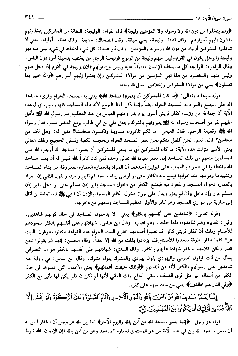 إِنَّما يَعْمُرُ مَساجِدَ اللَّهِ مَنْ آمَنَ بِاللَّهِ وَالْيَوْمِ الْآخِرِ وَأَقامَ الصَّلاةَ وَآتَى الزَّكاةَ وَلَمْ يَخْشَ إِلاَّ اللَّهَ فَعَسى أُولئِكَ أَنْ يَكُونُوا مِنَ الْمُهْتَدِينَ (18)