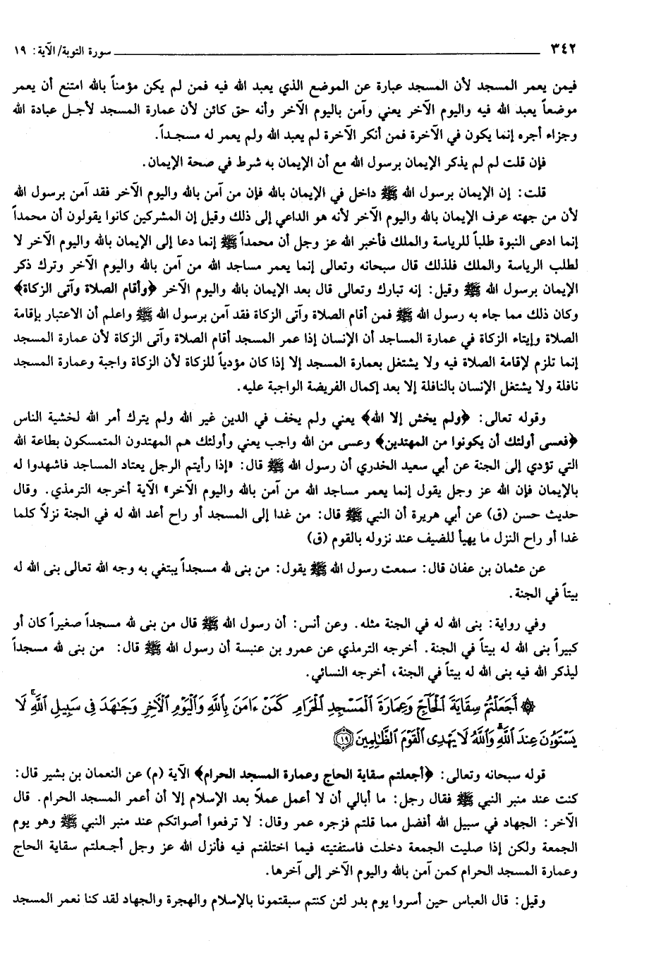 أَجَعَلْتُمْ سِقايَةَ الْحاجِّ وَعِمارَةَ الْمَسْجِدِ الْحَرامِ كَمَنْ آمَنَ بِاللَّهِ وَالْيَوْمِ الْآخِرِ وَجاهَدَ فِي سَبِيلِ اللَّهِ لا يَسْتَوُونَ عِنْدَ اللَّهِ وَاللَّهُ لا يَهْدِي الْقَوْمَ الظَّالِمِينَ (19)