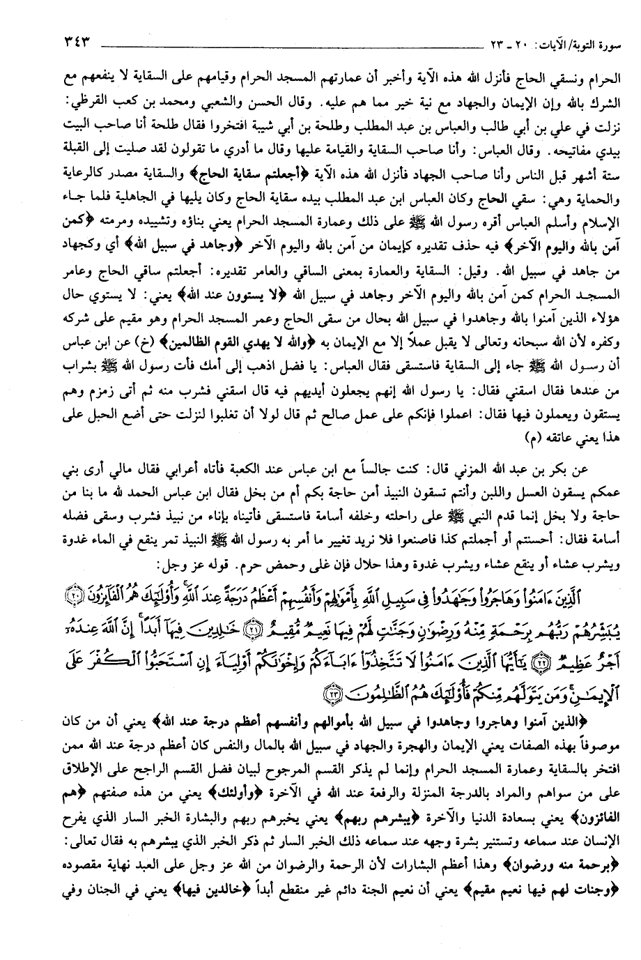 الَّذِينَ آمَنُوا وَهاجَرُوا وَجاهَدُوا فِي سَبِيلِ اللَّهِ بِأَمْوالِهِمْ وَأَنْفُسِهِمْ أَعْظَمُ دَرَجَةً عِنْدَ اللَّهِ وَأُولئِكَ هُمُ الْفائِزُونَ (20) يُبَشِّرُهُمْ رَبُّهُمْ بِرَحْمَةٍ مِنْهُ وَرِضْوانٍ وَجَنَّاتٍ لَهُمْ فِيها نَعِيمٌ مُقِيمٌ (21) خالِدِينَ فِيها أَبَداً إِنَّ اللَّهَ عِنْدَهُ أَجْرٌ عَظِيمٌ (22) يا أَيُّهَا الَّذِينَ آمَنُوا لا تَتَّخِذُوا آباءَكُمْ وَإِخْوانَكُمْ أَوْلِياءَ إِنِ اسْتَحَبُّوا الْكُفْرَ عَلَى الْإِيمانِ وَمَنْ يَتَوَلَّهُمْ مِنْكُمْ فَأُولئِكَ هُمُ الظَّالِمُونَ (23)
