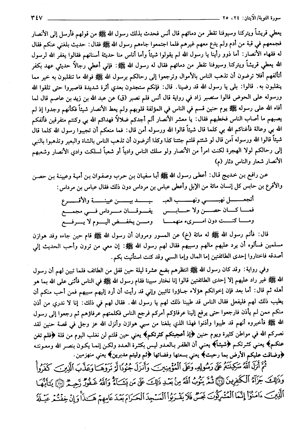 وفي رواية: وقد كان رسول الله صلى الله عليه وسلم انتظرهم بضع عشرة ليلة حين قفل من الطائف فلما تبين لهم أن رسول الله صلى الله عليه وسلم غير راد عليهم إلا إحدى الطائفتين قالوا إنا نختار سبينا فقام رسول الله صلى الله عليه وسلم في الناس فأثنى على الله بما هو أهله ثم قال: أما بعد فإن إخوانكم هؤلاء جاءوا تائبين وإني قد رأيت أن أرد إليهم سبيهم فمن أحب منكم أن يطيب ذلك لهم فليفعل فقال الناس قد طيبنا ذلك لهم يا رسول الله. فقال لهم في ذلك: إنا لا ندري من أذن منكم ممن لم يأذن فارجعوا حتى يرفع إلينا عرفاؤكم أمركم فرجع الناس فكلمتهم عرفاؤهم ثم رجعوا إلى رسول الله صلى الله عليه وسلم فأخبروه أنهم قد طيبوا وأذنوا فهذا الذي بلغنا من سبي هوازن وأنزل الله عز وجل في قصة حنين لقد نصركم الله في مواطن كثيرة ويوم حنين إِذْ أَعْجَبَتْكُمْ كَثْرَتُكُمْ يعني حين قلتم لن نغلب اليوم من قلة فَلَمْ تُغْنِ عَنْكُمْ يعني كثرتكم شَيْئاً يعني أن الظفر بالعدو ليس بكثرة العدد ولكن إنما يكون بنصر الله ومعونته وَضاقَتْ عَلَيْكُمُ الْأَرْضُ بِما رَحُبَتْ يعني بسعتها وفضائها ثُمَّ وَلَّيْتُمْ مُدْبِرِينَ يعني منهزمين.