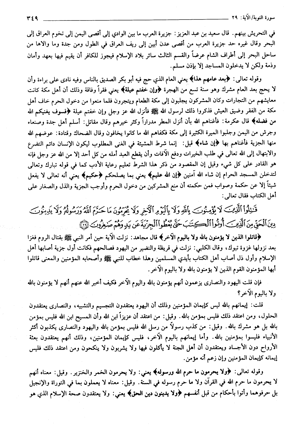 قاتِلُوا الَّذِينَ لا يُؤْمِنُونَ بِاللَّهِ وَلا بِالْيَوْمِ الْآخِرِ وَلا يُحَرِّمُونَ ما حَرَّمَ اللَّهُ وَرَسُولُهُ وَلا يَدِينُونَ دِينَ الْحَقِّ مِنَ الَّذِينَ أُوتُوا الْكِتابَ حَتَّى يُعْطُوا الْجِزْيَةَ عَنْ يَدٍ وَهُمْ صاغِرُونَ (29)