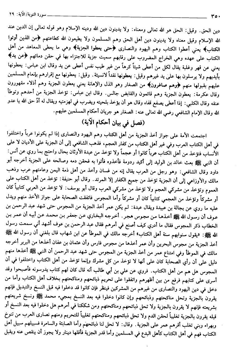 ((فصل في بيان أحكام الآية)) اجتمعت الأمة على جواز أخذ الجزية من أهل الكتاب وهم اليهود والنصارى إذا لم يكونوا عربا واختلفوا في أهل الكتاب العرب وفي غير أهل الكتاب من كفار العجم، فذهب الشافعي إلى أن الجزية على الأديان لا على الأنساب فتؤخذ من أهل الكتاب عربا كانوا أو عجما ولا تؤخذ من عبدة الأوثان بحال واحتج بما روي عن أنس: