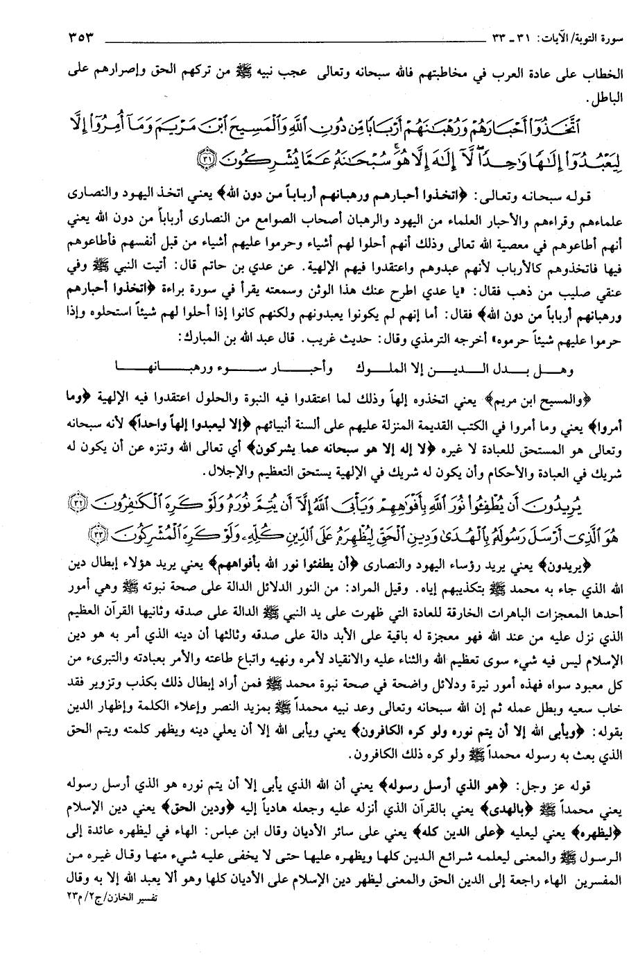 اتَّخَذُوا أَحْبارَهُمْ وَرُهْبانَهُمْ أَرْباباً مِنْ دُونِ اللَّهِ وَالْمَسِيحَ ابْنَ مَرْيَمَ وَما أُمِرُوا إِلاَّ لِيَعْبُدُوا إِلهاً واحِداً لا إِلهَ إِلاَّ هُوَ سُبْحانَهُ عَمَّا يُشْرِكُونَ (31)