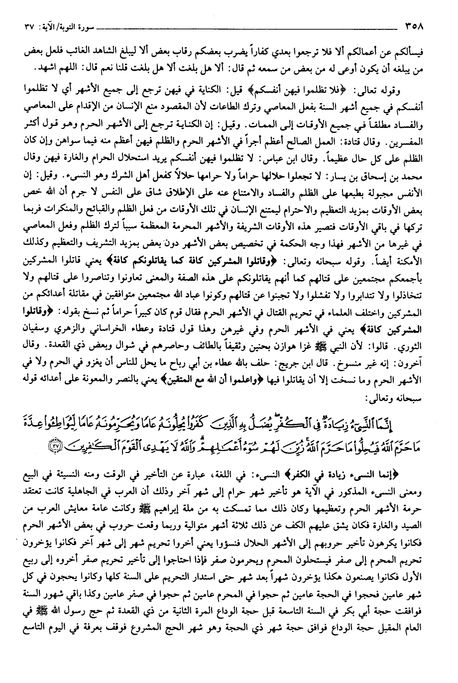 إِنَّمَا النَّسِيءُ زِيادَةٌ فِي الْكُفْرِ النسيء: في اللغة، عبارة عن التأخير في الوقت ومنه النسيئة في البيع ومعنى النسيء المذكور في الآية هو تأخير شهر حرام إلى شهر آخر وذلك أن العرب في الجاهلية كانت تعتقد حرمة الأشهر الحرم وتعظيمها وكان ذلك مما تمسكت به من ملة إبراهيم صلى الله عليه وسلم وكانت عامة معايش العرب من الصيد والغارة فكان يشق عليهم الكف عن ذلك ثلاثة أشهر متوالية وربما وقعت حروب في بعض الأشهر الحرم فكانوا يكرهون تأخير حروبهم إلى الأشهر الحلال فنسؤوا يعني أخروا تحريم شهر إلى شهر آخر فكانوا يؤخرون تحريم المحرم إلى صفر فيستحلون المحرم ويحرمون صفر فإذا احتاجوا إلى تأخير تحريم صفر أخروه إلى ربيع الأول فكانوا يصنعون هكذا يؤخرون شهرا بعد شهر حتى استدار التحريم على السنة كلها وكانوا يحجون في كل شهر عامين فحجوا في الحجة عامين ثم حجوا في المحرم عامين ثم حجوا في صفر عامين وكذا باقي شهور السنة فوافقت حجة أبي بكر في السنة التاسعة قبل حجة الوداع المرة الثانية من ذي القعدة ثم حج رسول الله صلى الله عليه وسلم في العام المقبل حجة الوداع فوافق حجة شهر ذي الحجة وهو شهر الحج المشروع فوقف بعرفة في اليوم التاسع