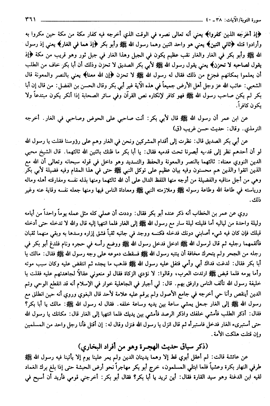 عن ابن عمر أن رسول الله صلى الله عليه وسلم قال لأبي بكر: أنت صاحبي على الحوض وصاحبي في الغار. أخرجه الترمذي. وقال: حديث حسن غريب (ق) عن أبي بكر الصديق قال: نظرت إلى أقدام المشركين ونحن في الغار وهم على رؤوسنا فقلت يا رسول الله لو أن أحدهم نظر إلى قدميه أبصرنا تحت قدميه فقال: يا أبا بكر ما ظنك باثنين الله ثالثهما. قال الشيخ محيي الدين النووي معناه: ثالثهما بالنصر والمعونة والحفظ والتسديد وهو داخل في قوله سبحانه وتعالى أن الله مع الذين اتقوا والذين هم محسنون وفيه بيان عظيم على توكل النبي صلى الله عليه وسلم حتى في هذا المقام وفيه فضيلة لأبي بكر وهي من أجل مناقبه والفضيلة من أوجه منها اللفظ الدال على أن الله ثالثهما ومنها بذله نفسه ومفارقته أهله وماله ورئاسته في طاعة الله وطاعة رسوله صلى الله عليه وسلم وملازمته النبي صلى الله عليه وسلم ومعاداة الناس فيها ومنها جعله نفسه وقاية عنه وغير ذلك.